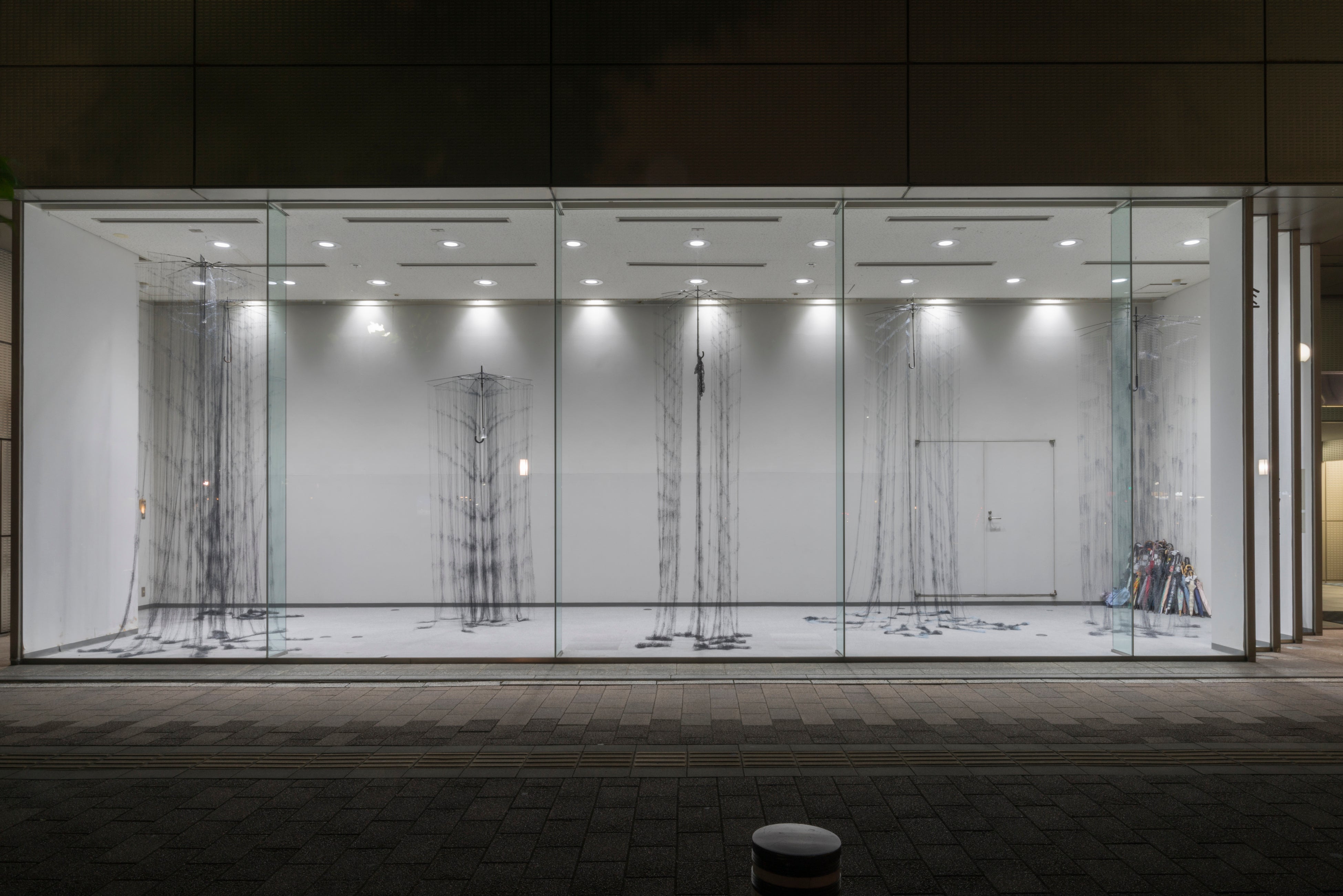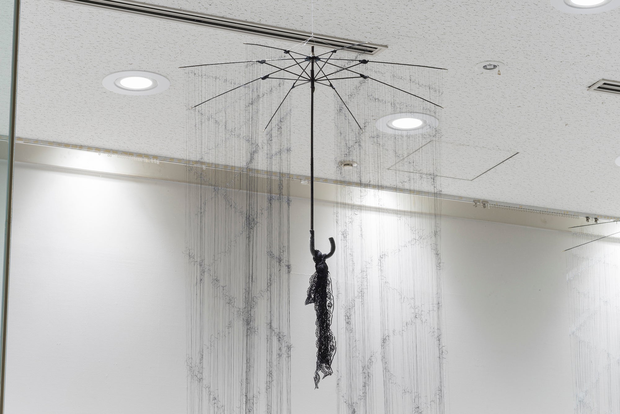 このたびゲストアーティストに迎えた平野薫は、物に宿る気配に着目し、古着の衣服などを糸の一本一本にまでほどき、再構成する繊細なインスタレーションを手がけてきた作家です。2022年4月から9月にかけて、平和大通り沿いに位置するヱビデンギャラリーにて開催された「平野薫『傘』」(主催:広島市現代美術館)では、広島の県内各所で収集した傘を素材としたインスタレーション作品を発表しました。今回の展示「気配這う」では、新作や公開制作を含む傘の作品群に、作家親族の旧家に残されていた織り機、そして家族が撮影した記念写真をもとにした作品を加えて構成されます。