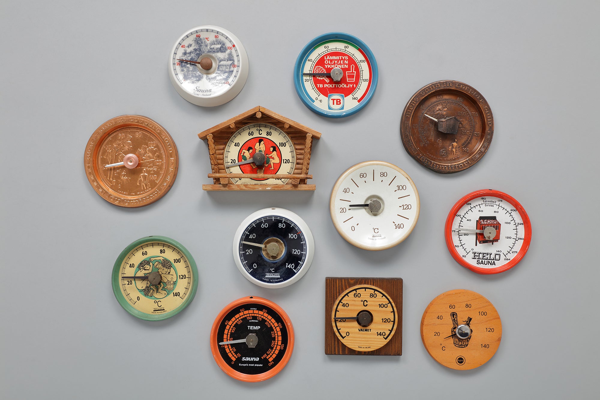 その時間を演出するのが、デザインされたさまざまな道具です。美しく手入れされた白樺のヴィヒタ、伝統的な木製の桶やひしゃく、そして代々受け継がれてきたサウナストーブ。ほかにもマグカップや温度計、サウナハットにいたるまで、約130点を展示します。