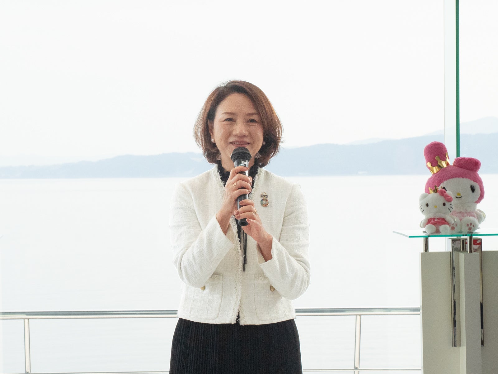 締結式には、スペシャルゲストとしてサンリオの人気キャラクター「ハローキティ」も出席。協定式の最後には、両代表から地域への想いと今後の展望が語られました。日出町 安部徹也町長は、「ハーモニーランドとは開園以来深い関わりがある中、リゾート化をきっかけに相互に連携を強化するためにも、包括連携協定を結ぶ運びとなりました。ハーモニーランドを訪れる皆様を日出町の周遊、食へとつなげることでハーモニータウンの形成に寄与することを確信しております。」と語りました。また、サンリオエンターテイメントの代表取締役社長 小巻亜矢は、「ハーモニーランドが35周年をむかえるタイミングで包括連携協定を結べたのはありがたく背筋の伸びる思いです。35周年のメッセージ“ありがとうを未来へ”の言葉と共にこれまでお世話になった日出町へ恩返しをしていきたい。」と述べ、日出町との今後の連携に対する期待を表しました。