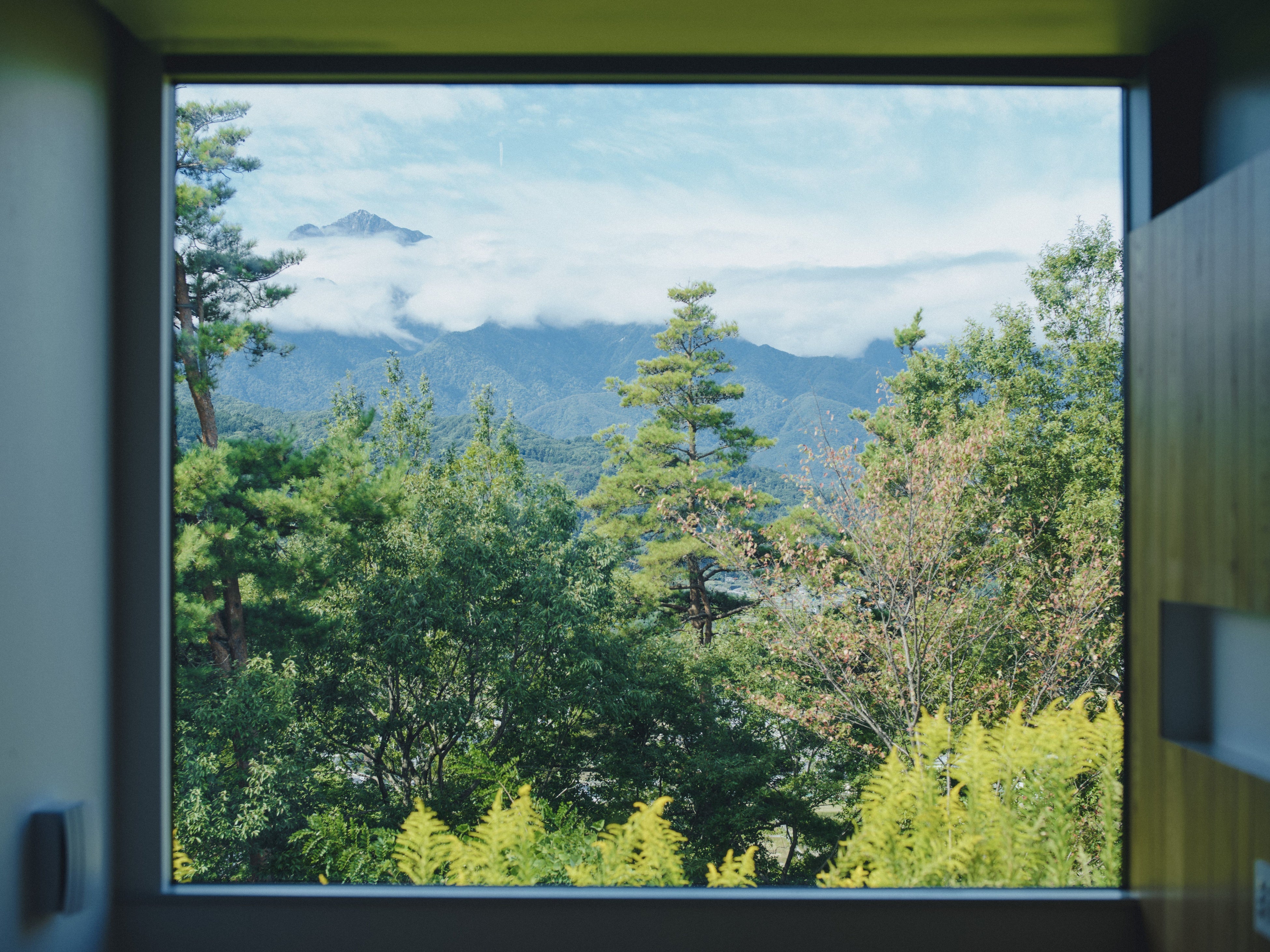 大きな窓から森と山々を望み、夜には月明かりがやさしく部屋を照らします。