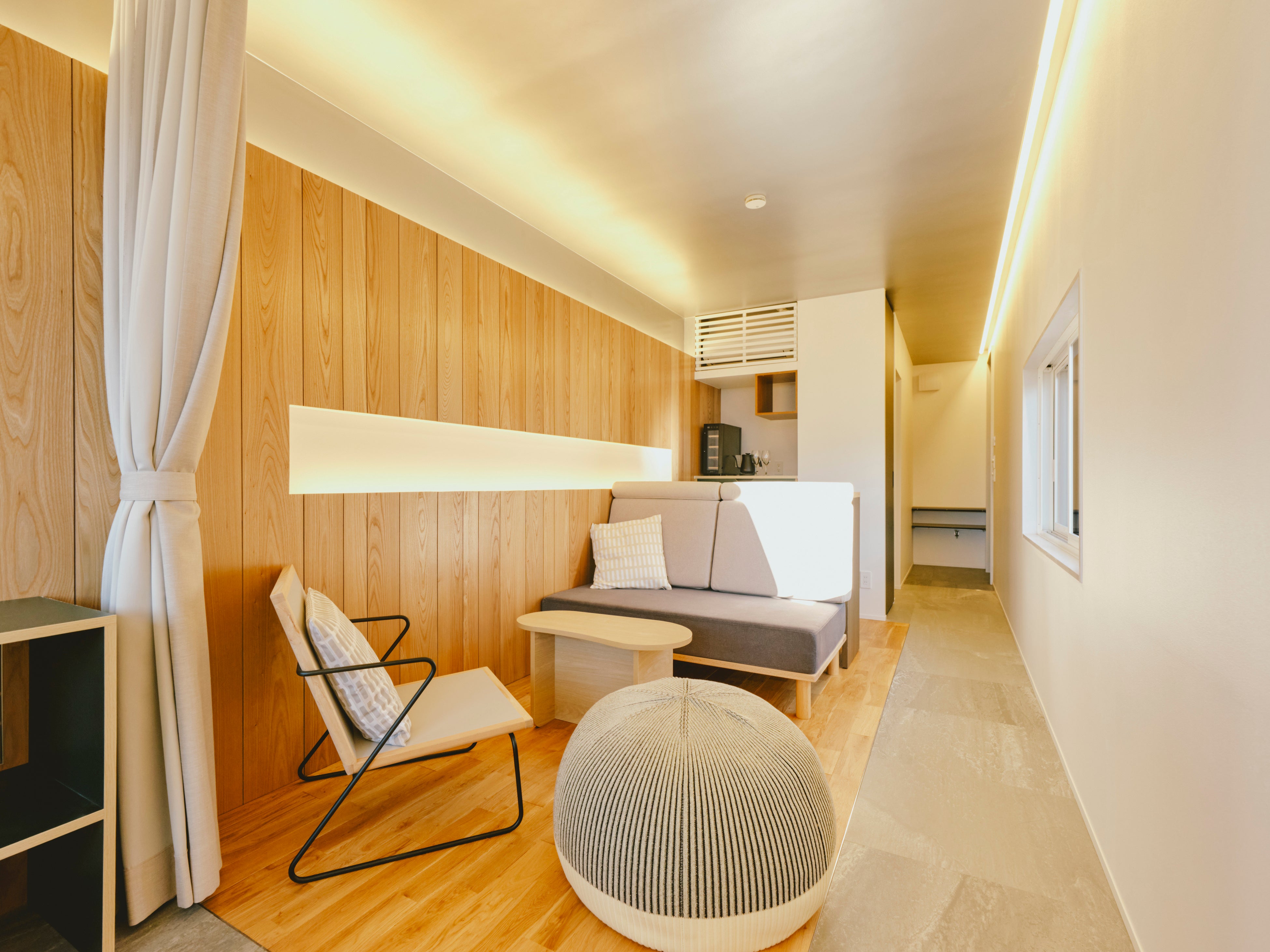 棟内設備:露天風呂、シャワー、ベッド(NELL製)、トイレ、リビングスペース、デッキスペース、エアコン、冷蔵庫、ワインセラー(一部客室)