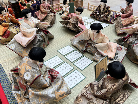 北モールステージでは、百人一首や宴の様子など、物語の一場面を切り取ったような情景展示を展開しています。通路から間近で鑑賞できるため、人形一体一体の表情やしぐさ、衣装の細やかな意匠までじっくりとご覧いただけます。大階段のダイナミックなスケールとは対照的に、場面ごとの世界観やストーリー性を感じられる展示構成が特徴です。寄附者からは「飾ってもらえてうれしい」「自分の雛人形だと分かるので、毎年見に来るのが楽しみ」といった声も寄せられており、人形との再会の場としても親しまれています。