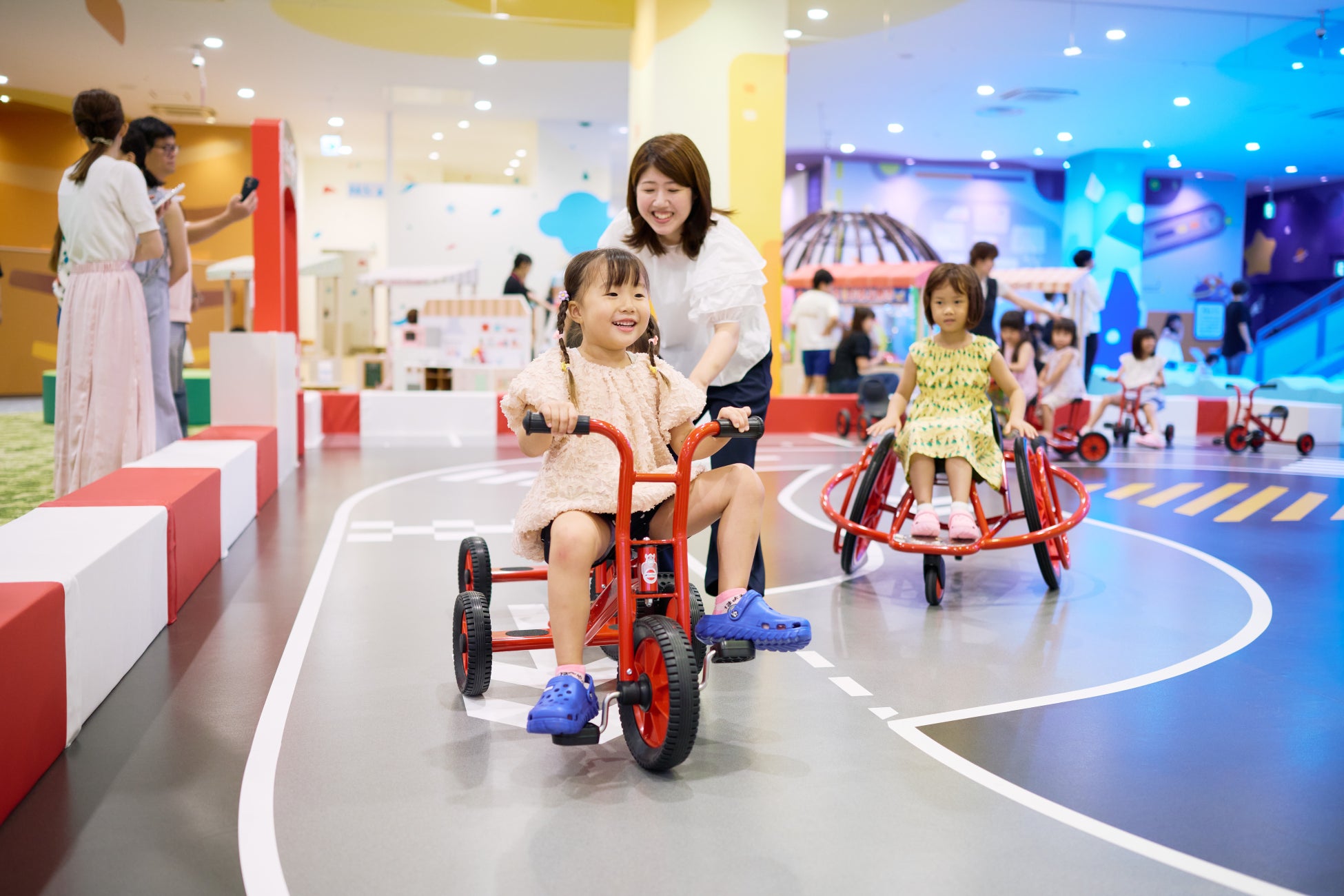 世界のメーカーから厳選した知育玩具や、ラーメン屋さん、スーパーマーケット、アイスクリームショップなど本格的ななりきり遊びができるコーナー。サーキットコーナーでは三輪車やホイールライダーなどの乗り物のおもちゃに乗って遊ぶことができます。