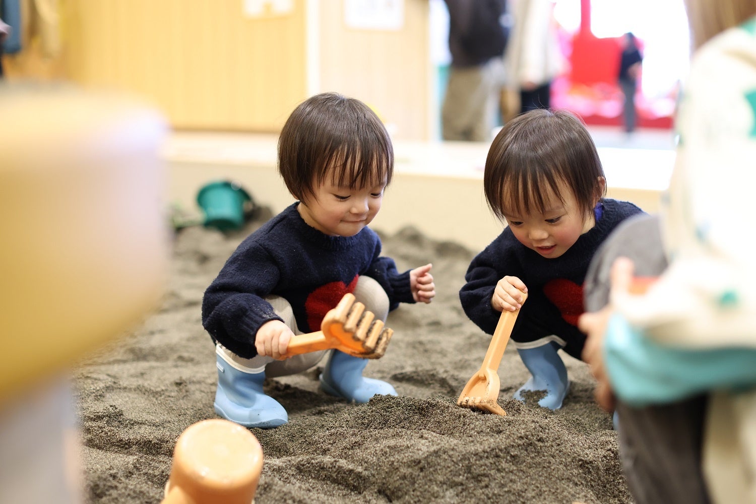 想像力と創造力が培われる砂遊びができる砂場コーナー。砂は安心の抗菌砂です。椅子に座って遊べる砂遊びコーナーは車いすでもご利用可能です。