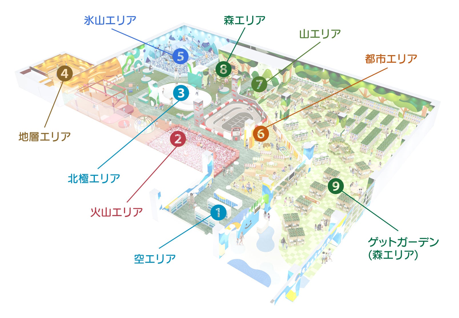 「ちきゅうのにわ」は、0歳の赤ちゃんから12歳を対象に、子どもとファミリーが夢中であそびながら地球の面白さや自然の大切さが学べるプレイグラウンドです。2023年3月に1号店「ちきゅうのにわ 東京ソラマチ店」をオープンし、今回が20店舗目となります。「氷山」「火山」「地層」など自然をモチーフにした各エリアには、北極の氷をイメージしたふわふわドーム、マグマをイメージしたボールプール、砂に触れる感覚を楽しめる砂場、定期的に開催するSDGsや自然の大切さを学べるワークショップなど、屋内にありながら自然とふれあうように子どもたちの「こころ・からだ・あたま」の成長を促す、楽しいあそびがたくさん詰まっています。