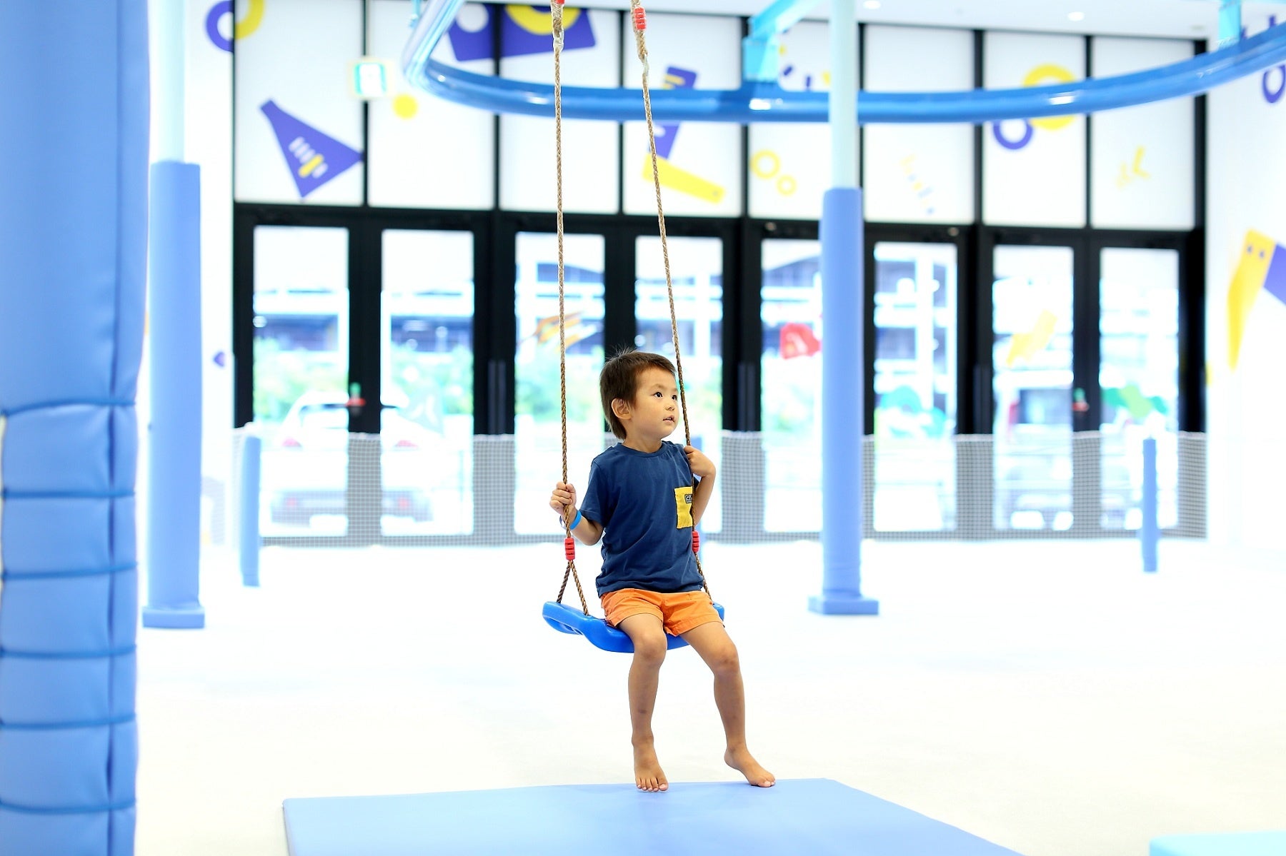 ぐるりと1周約21mの空中散歩が楽しめる大型遊具「スカイレールグライダー」がちきゅうのにわに初登場します。この遊具は「ちきゅうのにわ幕張新都心店」に併設の未来の遊び創造研究所「ちきゅうのにわプレイラボ」にて、実際にお子さまに遊んでいただき、お客さまの声を反映した当社オリジナルの大型遊具です。