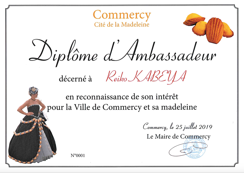 その後、コメルシーの城への想い、そしてマドレーヌの歴史を未来へつなぎたいという熱意を、市長へ手紙に綴りました。幾度も現地を訪れ真摯に想いを伝え続けた結果その情熱が評価され、2018年5月1日、フランスより来日していただき、コメルシー市公認「マドレーヌ大使」に任命されました。