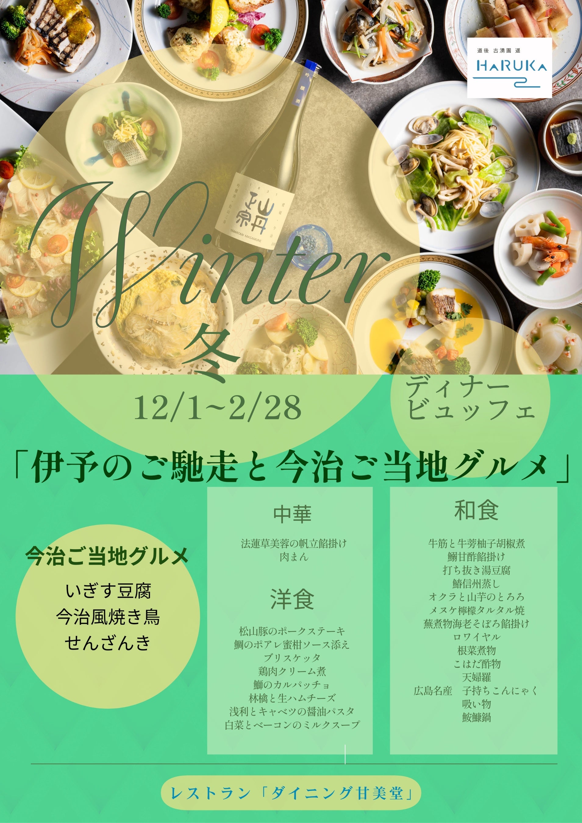 ホテル古湧園遥の2階レストラン「ダイニング甘美堂」では、季節にあわせて3か月ごとに料理メニューを変更。バイキング料理は地産地消にテーマを設定、地元の郷土料理と酒蔵を紹介しています。
