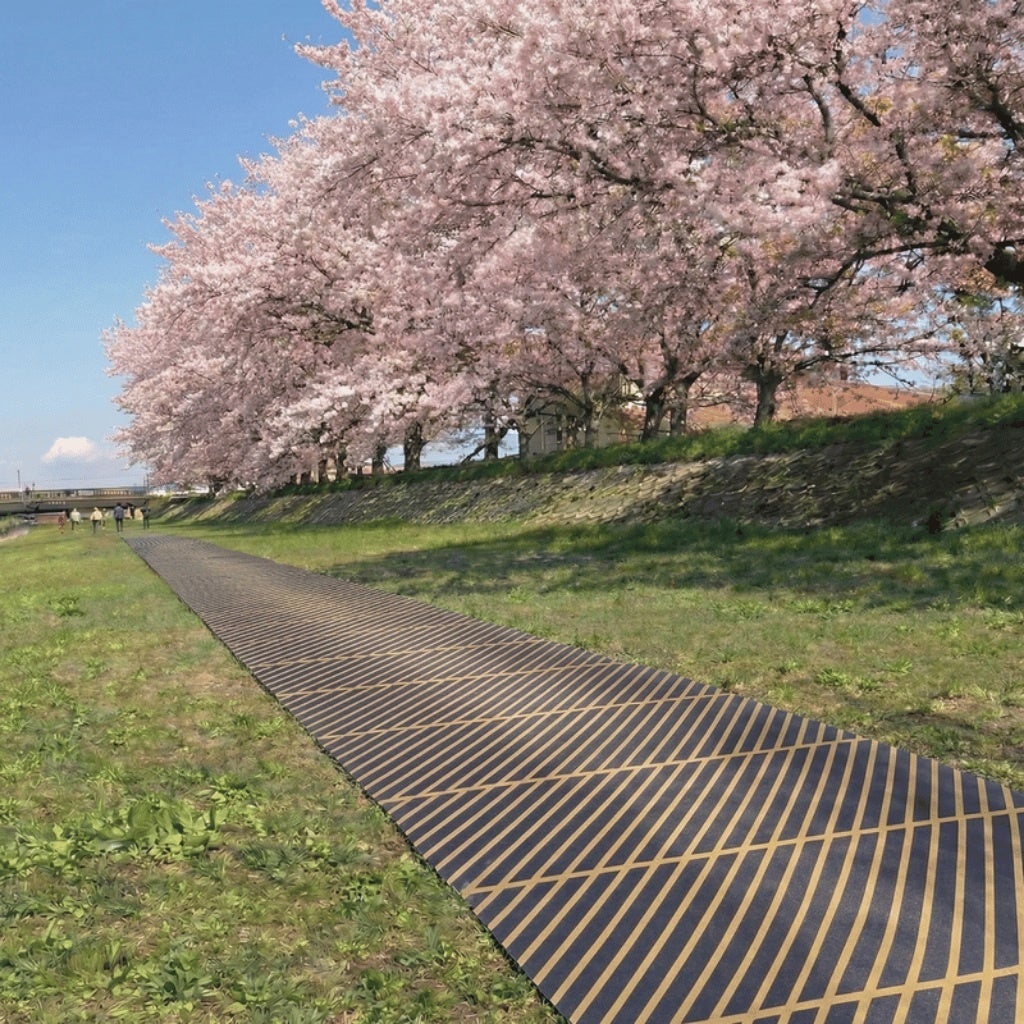 製紙メーカーの技術が詰まった20メートルの長い一筋が、春の川辺をどう彩るのか。自然と一体になる心地よさを、ぜひ現地でご体感ください。