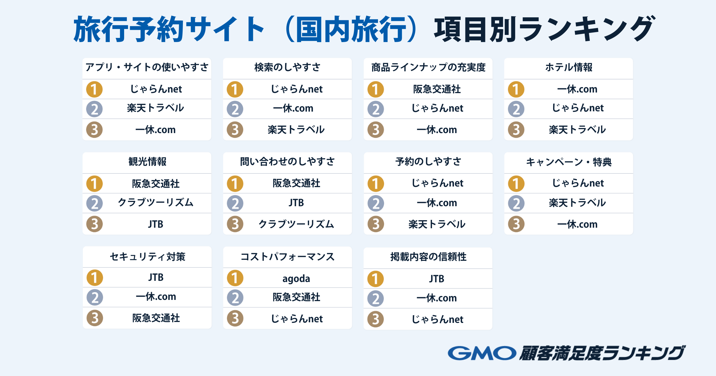 項目別ランキングでは、じゃらんnetが「使いやすさ」「予約のしやすさ」などユーザビリティに関する主要項目を含む最多4冠を達成しました。また、阪急交通社は「商品ラインナップ」や「観光情報」といったコンテンツ面で強みを見せ3冠を獲得しました。