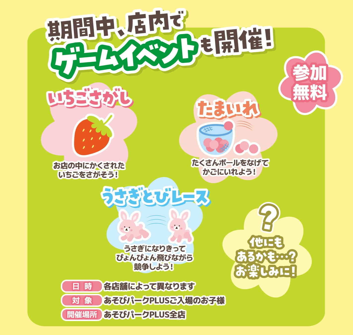 「いちごさがし」「たまいれ」「うさぎとびレース」など、店舗ごとに異なる内容でお楽しみいただけます。