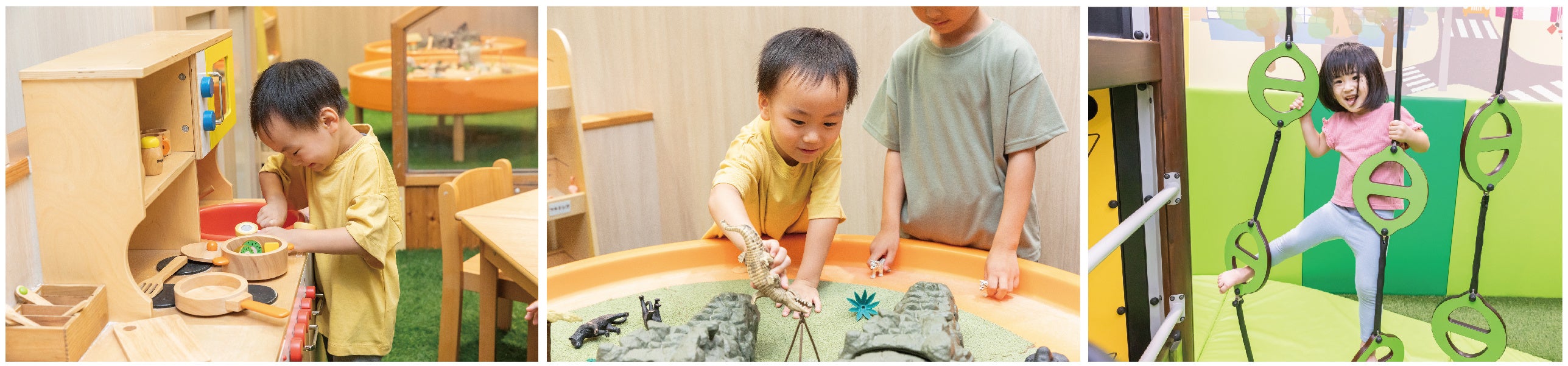 明るく広々とした解放感のある芝生が広がる空間の中で、子どもたちがのびのびと夢中になれる遊びが盛りだくさんな親子のためのあそび場です。子どもの成長に欠かせない3大要素“感覚運動あそび・組み立てあそび・創造あそび”を取り入れ、子どもの自由な発想を引き出す遊具がたくさん詰まっています。