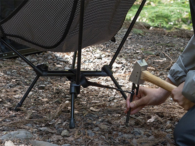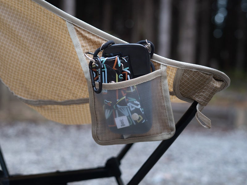 スマホや鍵の収納にぴったりなサイドポケットを装備。さらに軽量チェアの弱点である「風で吹き飛ばされる」トラブルを防ぐためのチェアアンカー用タイベルトをセットにしました。フィールドでの実際の使い勝手を追求した「かゆい所に手が届く」実用的なディテールです。
