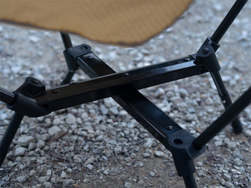 座面下の「エックス構造」のフレームにより軽量・コンパクトモデルにありがちな「座った時の不安な揺れ」を抑制。 フレームには高強度アルミ合金、生地には超高分子ポリエチレン(UHMWPE)を織り込んだ強化ファブリックを採用し、スリムな外見に反して耐荷重130kgという高い信頼性を確保しています。成人男性が全身を預けても揺らぎにくく、コンパクトチェアであることを忘れるほどの安心感でゆったりと寛げる設計です。