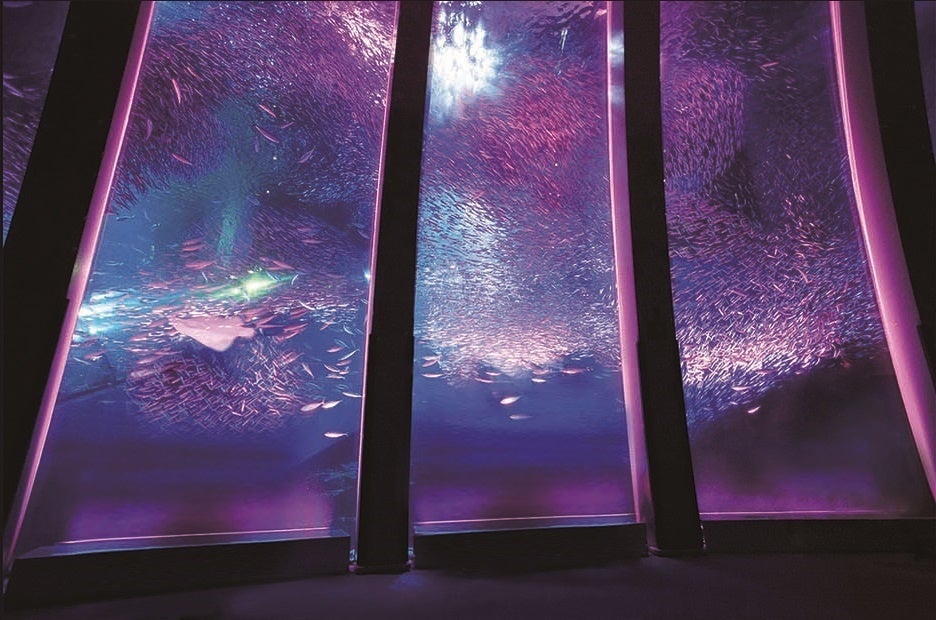 水族館「アクアミュージアム」にある高さ8m、水量1,500トンの大水槽「大海原に生きる群れと輝きの魚たち」では、国内最多飼育数5万尾のイワシが桜を連想させる音楽やピンク色の照明に合わせて乱舞する「スーパーイワシイリュージョン 桜」を、3月2日(月)~4月24日(金)内の特定の時間帯にて開催いたします。
