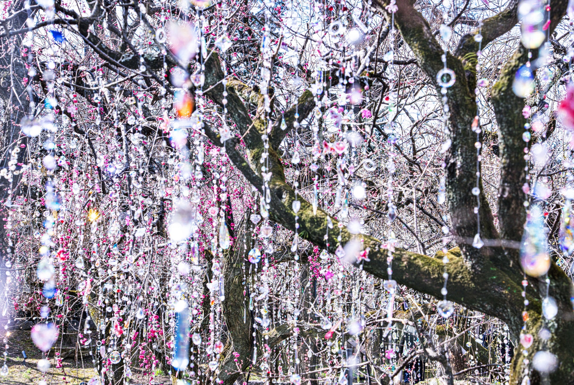 本フェスティバルでは、梅苑の木々に吊り下げられた約1,200本のクリスタルが、季節と光の変化とともに異なる表情を見せる屋外アートインスタレーション、梅苑「花の庭」《 光と花の庭 》を公開しています。菅原道真公が、十一歳の折に作られた漢詩「月夜見梅花(華)」の一節、「梅花似照星」になぞられえて制作された本作。鮮やかな色彩に染まる梅とクリスタルが溶け合い、響き合うことで唯一無二の情景を描き出します。刻一刻と姿を変えるその景観は、太陽の下はもちろん、夜の幻想的な表情もお楽しみいただけます。一足早い春の訪れと、光り輝くアートインスタレーションをぜひお楽しみください。