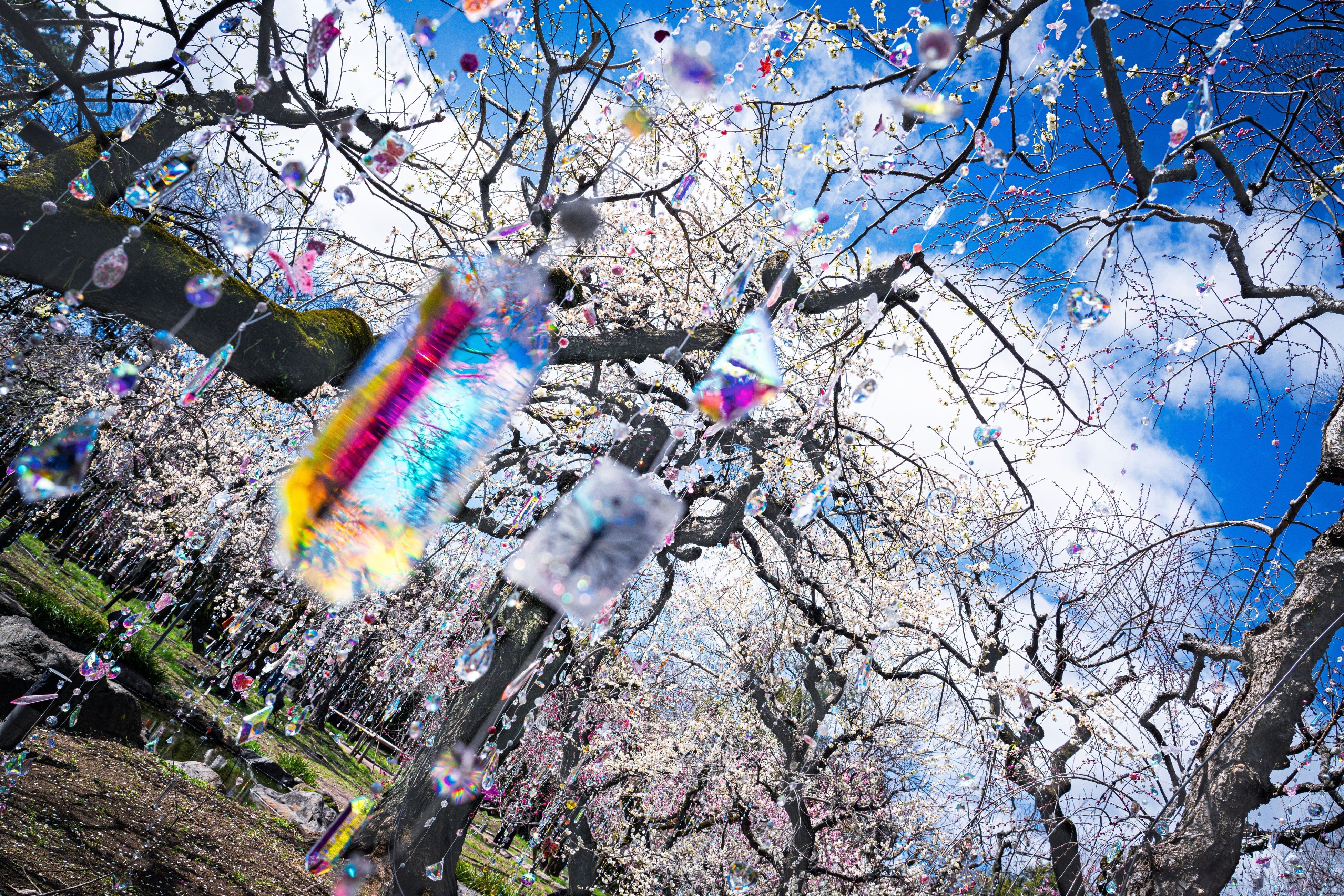 本フェスティバルでは、梅苑の木々に吊り下げられた約1,200本のクリスタルが、季節と光の変化とともに異なる表情を見せる屋外アートインスタレーション、梅苑「花の庭」《 光と花の庭 》を公開しています。菅原道真公が、十一歳の折に作られた漢詩「月夜見梅花(華)」の一節、「梅花似照星」になぞられえて制作された本作。鮮やかな色彩に染まる梅とクリスタルが溶け合い、響き合うことで唯一無二の情景を描き出します。刻一刻と姿を変えるその景観は、太陽の下はもちろん、夜の幻想的な表情もお楽しみいただけます。一足早い春の訪れと、光り輝くアートインスタレーションをぜひお楽しみください。