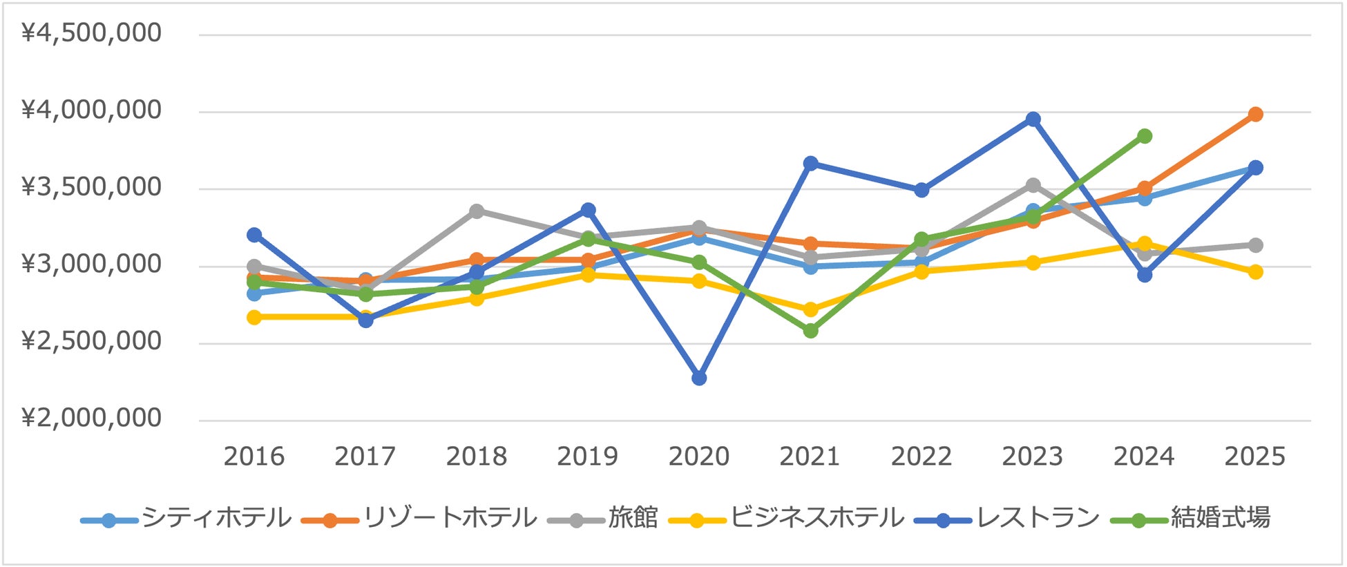 続いて求人施設を業態カテゴリごとに分類し、それぞれの採用時給与の推移を分析しました。集計対象となった求人企業を「シティホテル」「リゾートホテル」「旅館」「ビジネスホテル」「レストラン」「結婚式場」の6カテゴリに区分しています(※2025年は結婚式場の採用データなし)。各カテゴリの給与傾向には、業態ごとの特徴が見られました。