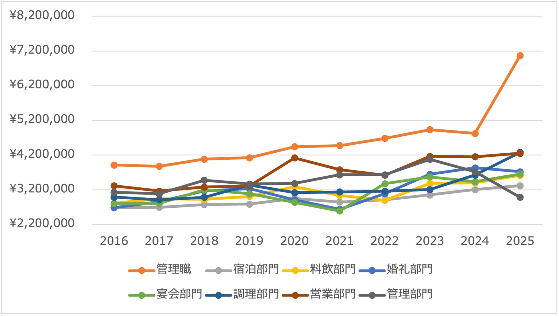 ホテル求人ドットコムの採用時の職種を「管理職」「宿泊部門」「料飲部門」「宴会部門」「婚礼部門」「調理部門」「営業部門」「管理部門」などに分類し、採用時給与の推移を分析しました。職種別の動向を見ると、役割特性や採用市場環境の違いが反映された変化が確認されます。