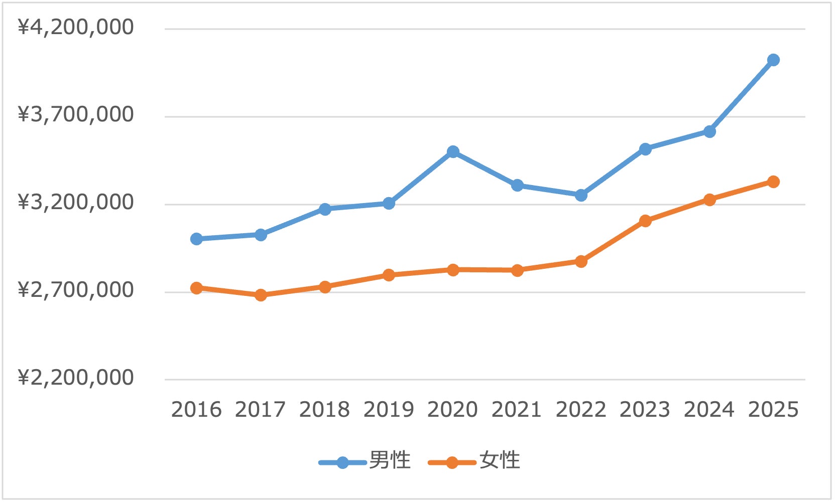 男性の平均提示年収は、長期的には緩やかな上昇基調で推移しています。年度ごとの調整局面は見られるものの、全体としては安定した増加傾向を維持しており、直近では比較的明確な上昇が確認されます。採用市場における人材需要の変化や、採用ポジションの構成が影響している可能性が考えられます。