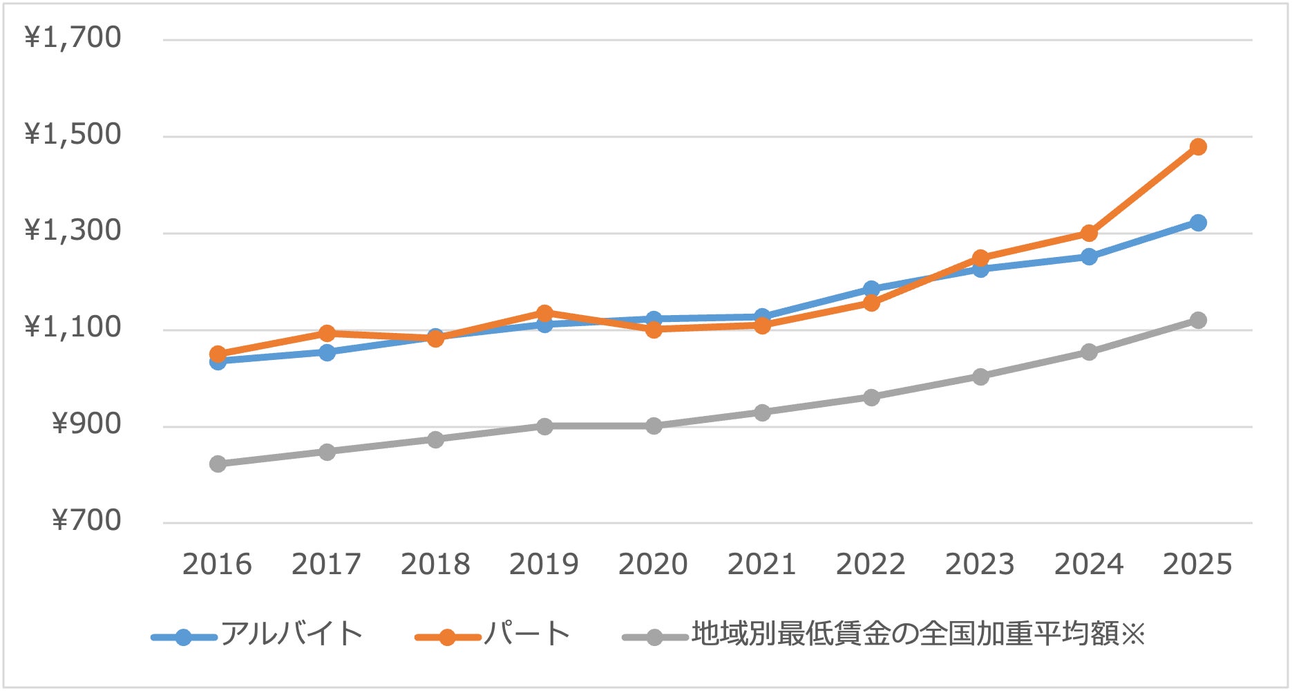 地域別最低賃金の全国加重平均額が継続的に引き上げられる中、提示時給水準も長期的には同方向で推移しています。ただし近年の特徴として、最低賃金の上昇のみでは説明しきれない提示時給の変動も見られます。特にパート採用では年度間の変動幅が比較的大きく、直近では上昇傾向が強まっています。