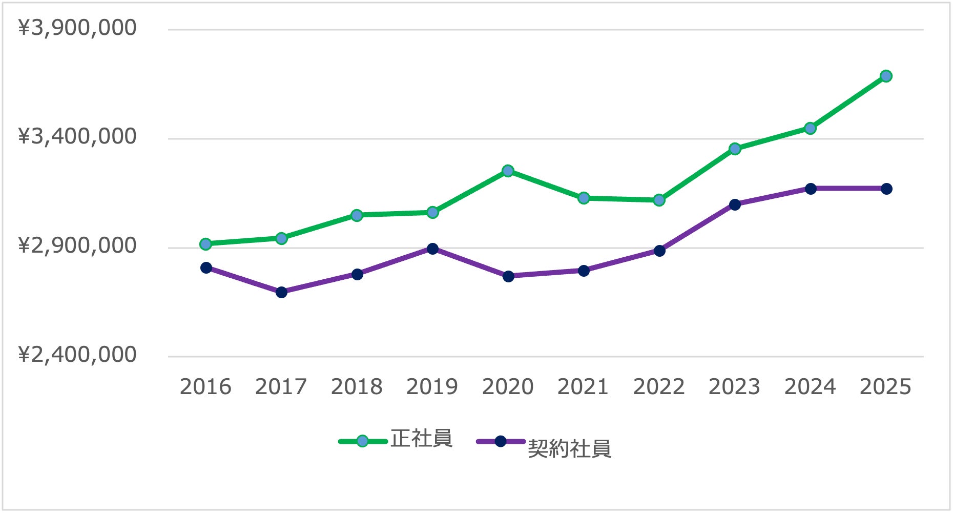 契約社員・正社員の年収推移についても、長期的には上昇基調が確認されます。正社員の平均提示年収は2016年の2,918,042円から2025年には3,689,094円へ上昇しており、契約社員も同期間で2,809,781円から3,172,875円へ上昇しています。ただし、提示年収の変動は必ずしも連続的ではなく、年度ごとの増減や調整も見られます。