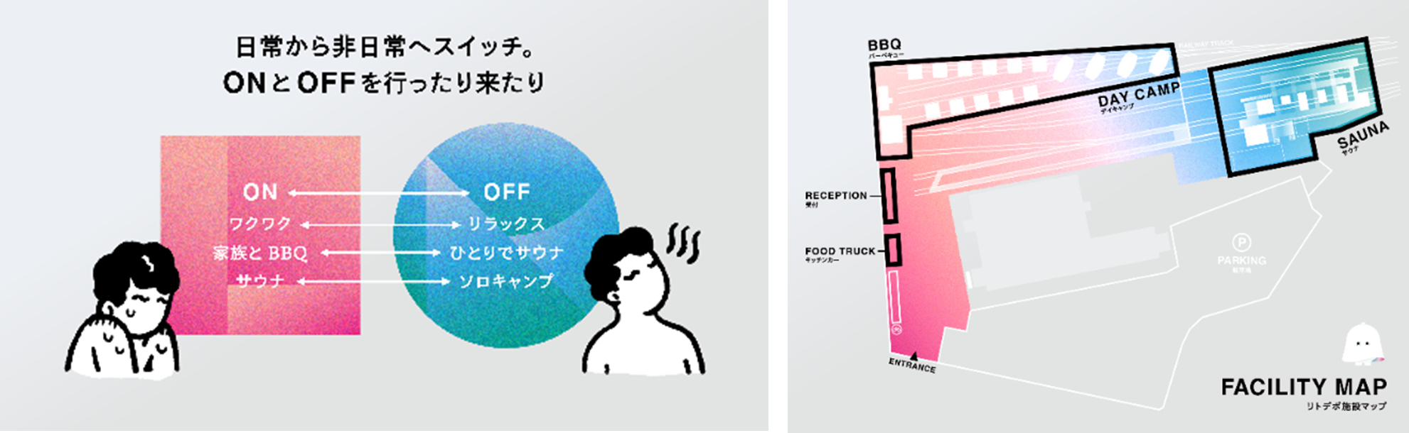 JR東日本の旧・大宮運転区跡地にオープンした、サウナ・キャンプ・BBQが線路敷で気軽に楽しめる新複合アウトドア施設です。廃レールや点検設備を景観に活かした、ここでしか体験できないユニークな雰囲気の中で、隣を走る在来線・新幹線を眺めながらアウトドア体験ができます。