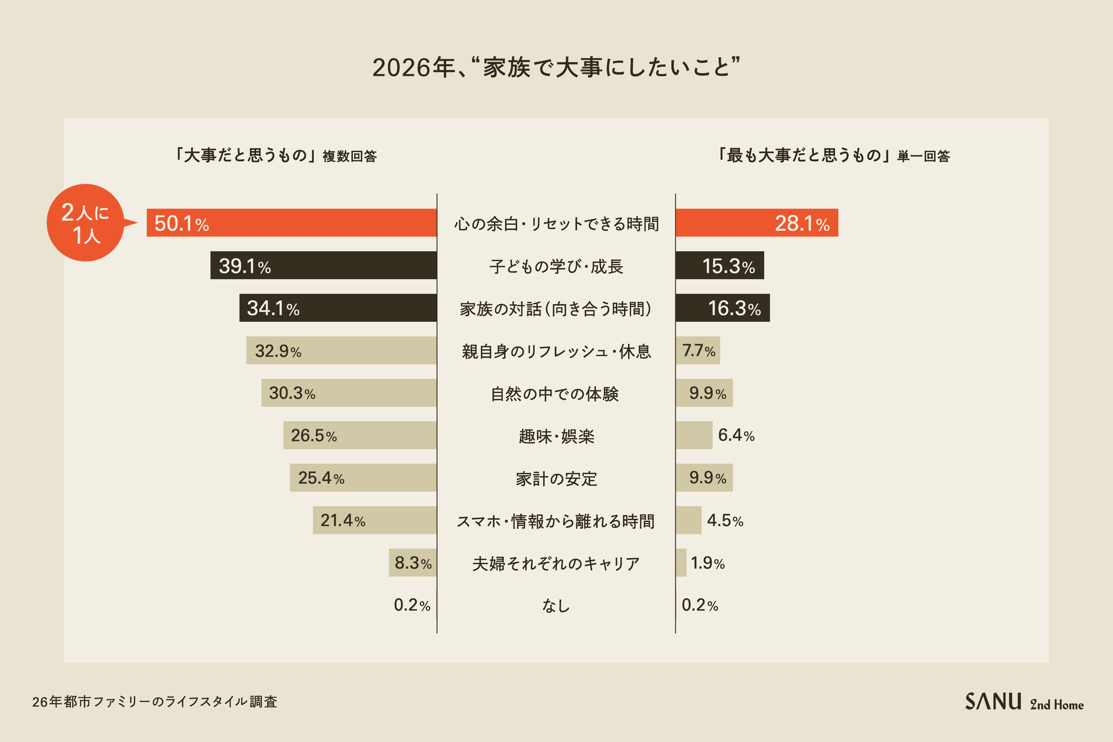 2026年、都市ファミリーの2人に1人が、家族で大切にしたいものとして「心の余白・リセットできる時間(50.1%)」を挙げ、「最も大事なもの」としても全項目で1位となりました(図1)。