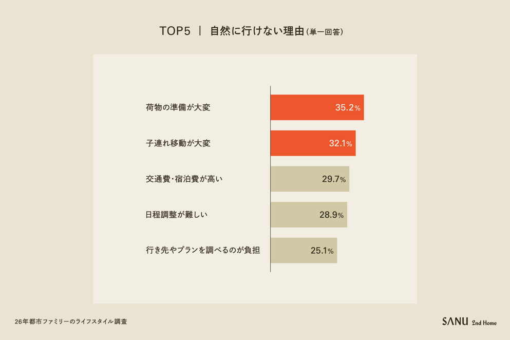 99.0%が「自然が暮らしには必要」と回答する一方で、理想の頻度と実際の頻度には大きな乖離が見られました(図4)。その理由は金銭面だけでなく、荷物の準備・日程調整・調べものといった「段取り」に伴う負荷にあります(図5)。