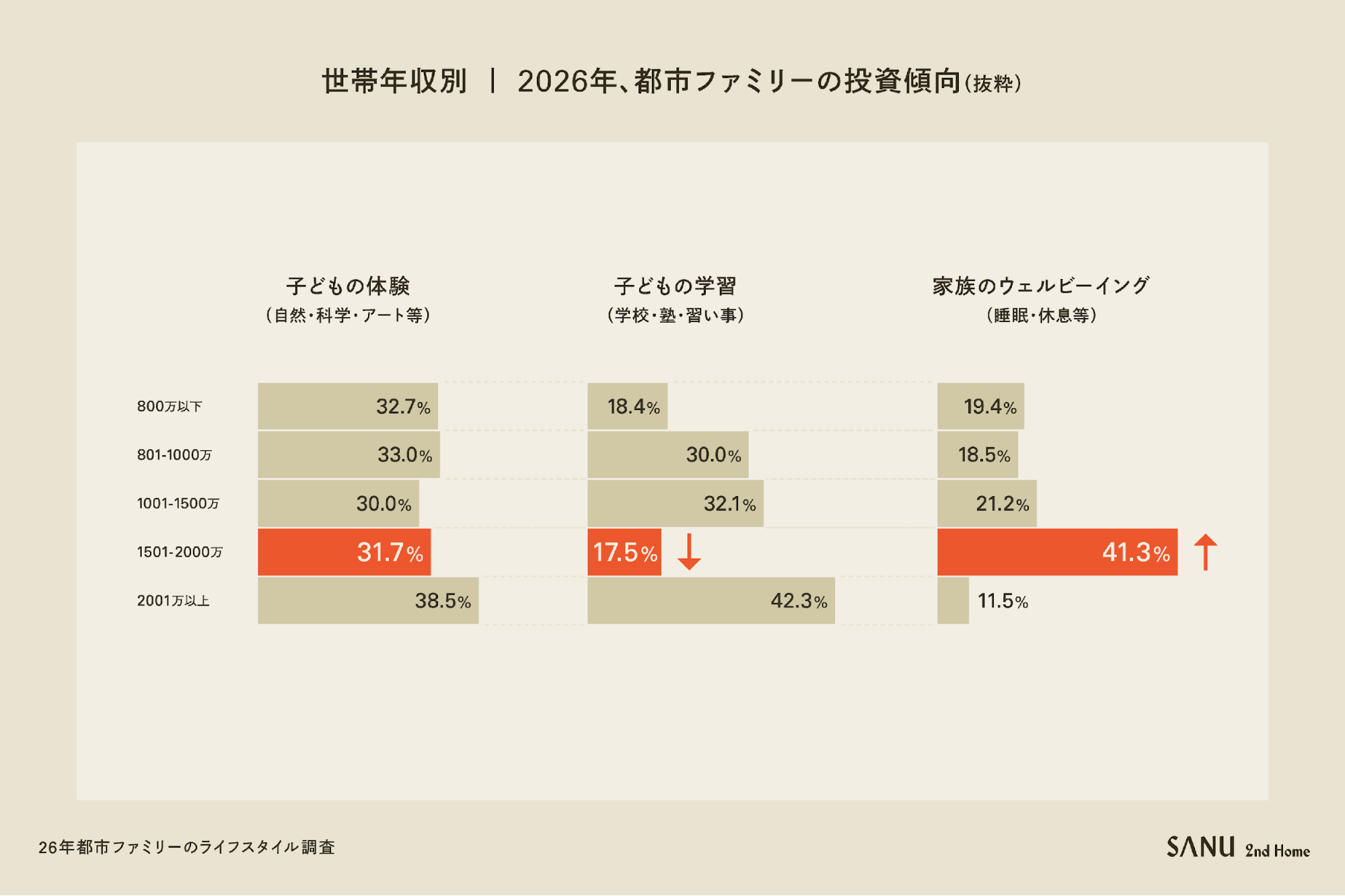 世帯年収1,500〜2,000万円層では「家族のウェルビーイング(41.3%)」が「子どもの学習(17.5%)」を大きく上回り、コンディションを優先する傾向が明確に。