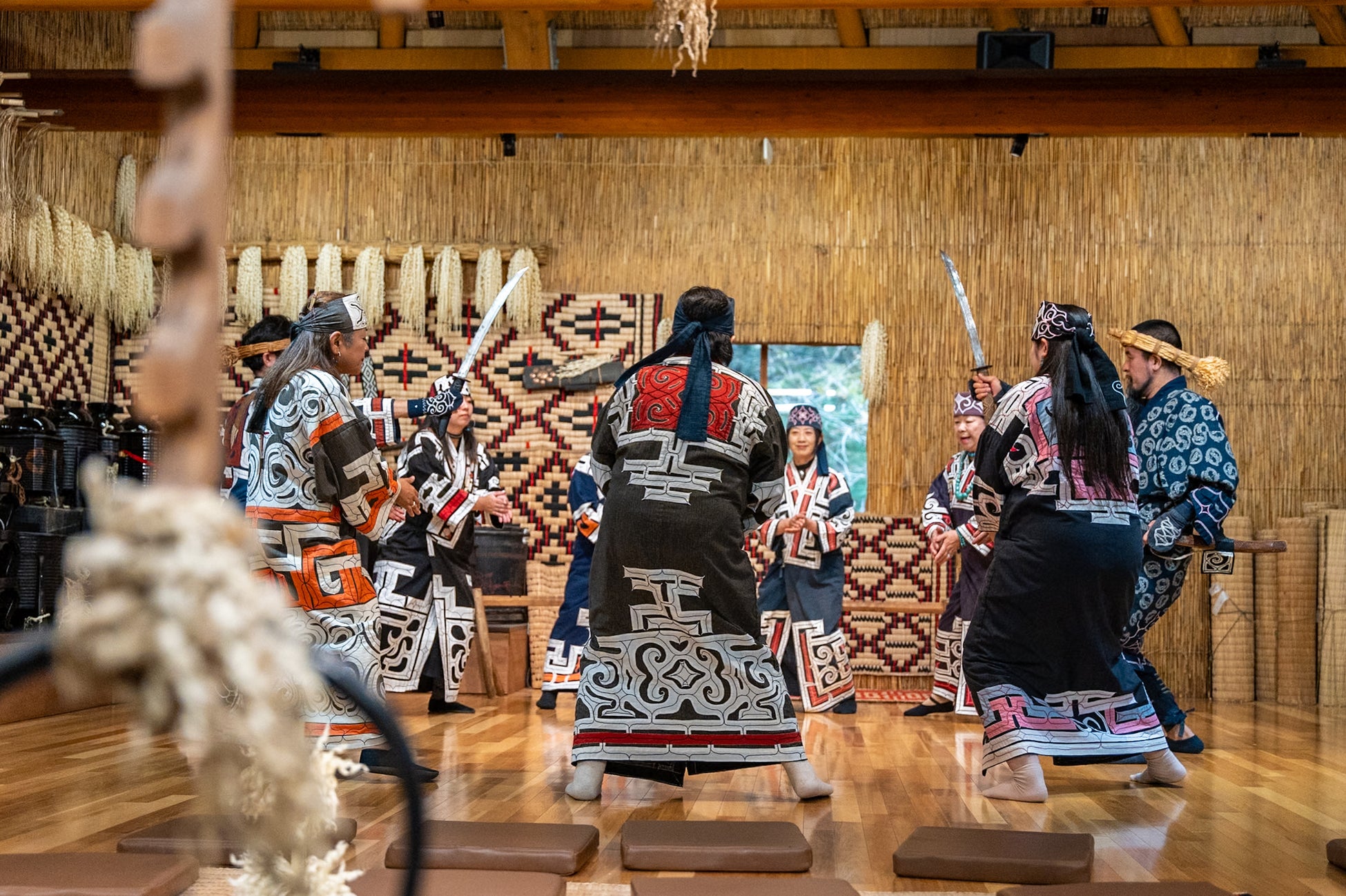 手前に炉鍵とイナウ(木幣)が写りこみ、暖かな囲炉裏を囲んで舞踊を一緒に楽しんでいる構図も素敵です。