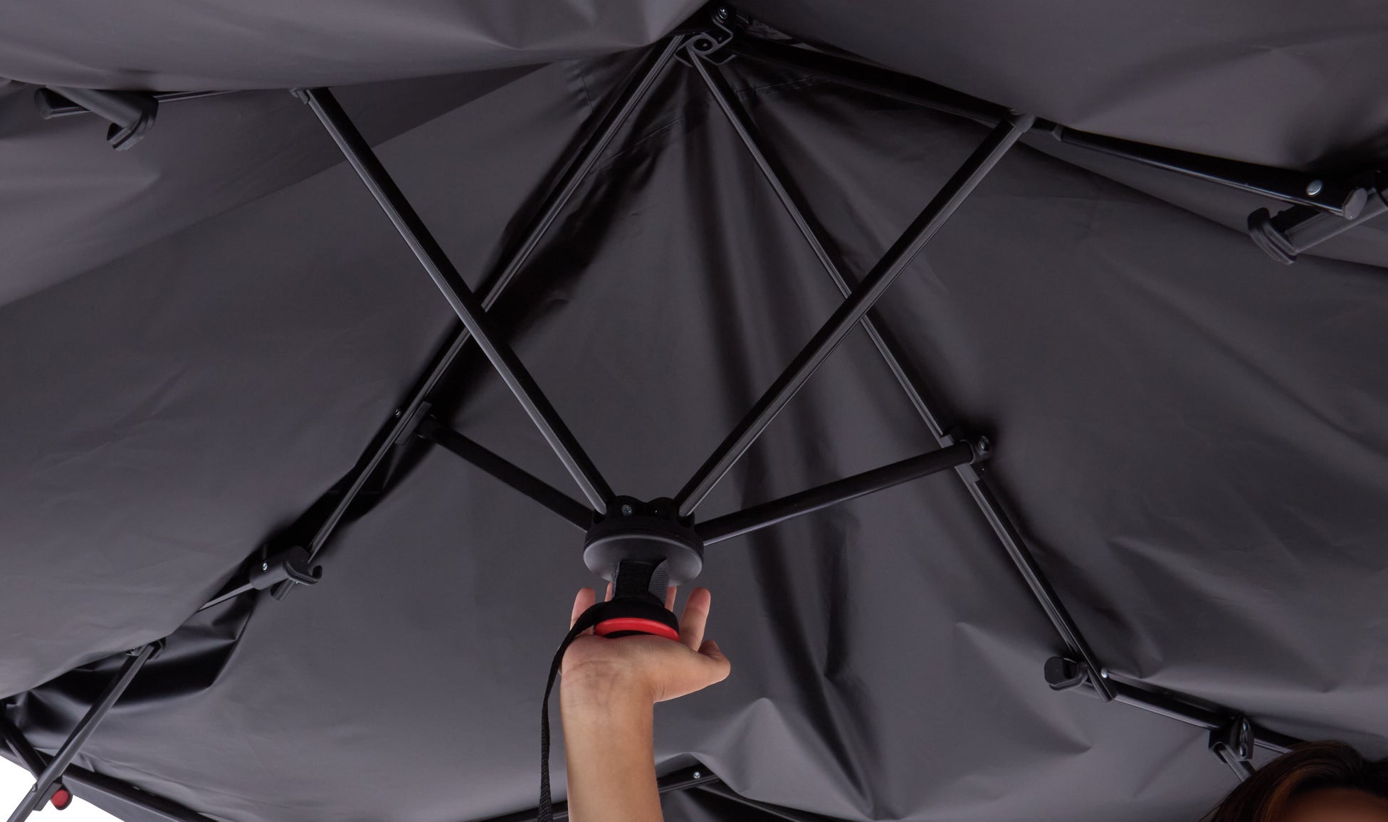 フレームにシェードスキンを被せて中央部分を押し上げるだけのワンタッチシステムを採用しており、簡単に設営可能。撤収時は、天井フレーム中央のベルトを引っ張るだけで収束させることができます。