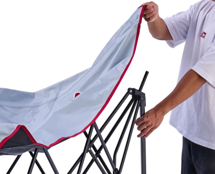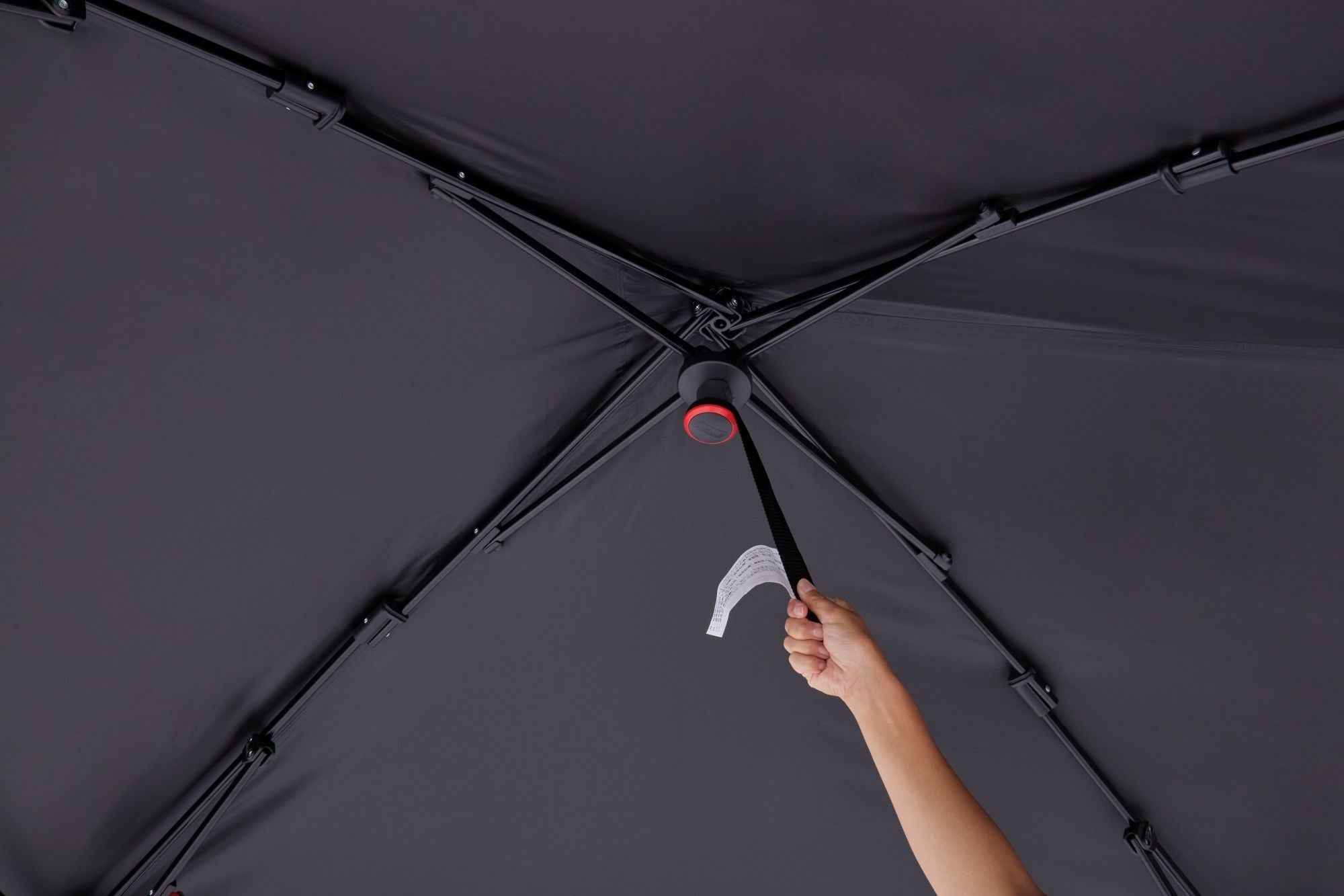 フレームにシェードスキンを被せて中央部分を押し上げるだけのワンタッチシステムを採用しており、簡単に設営可能。撤収時は、天井フレーム中央のベルトを引っ張るだけで収束させることができます。
