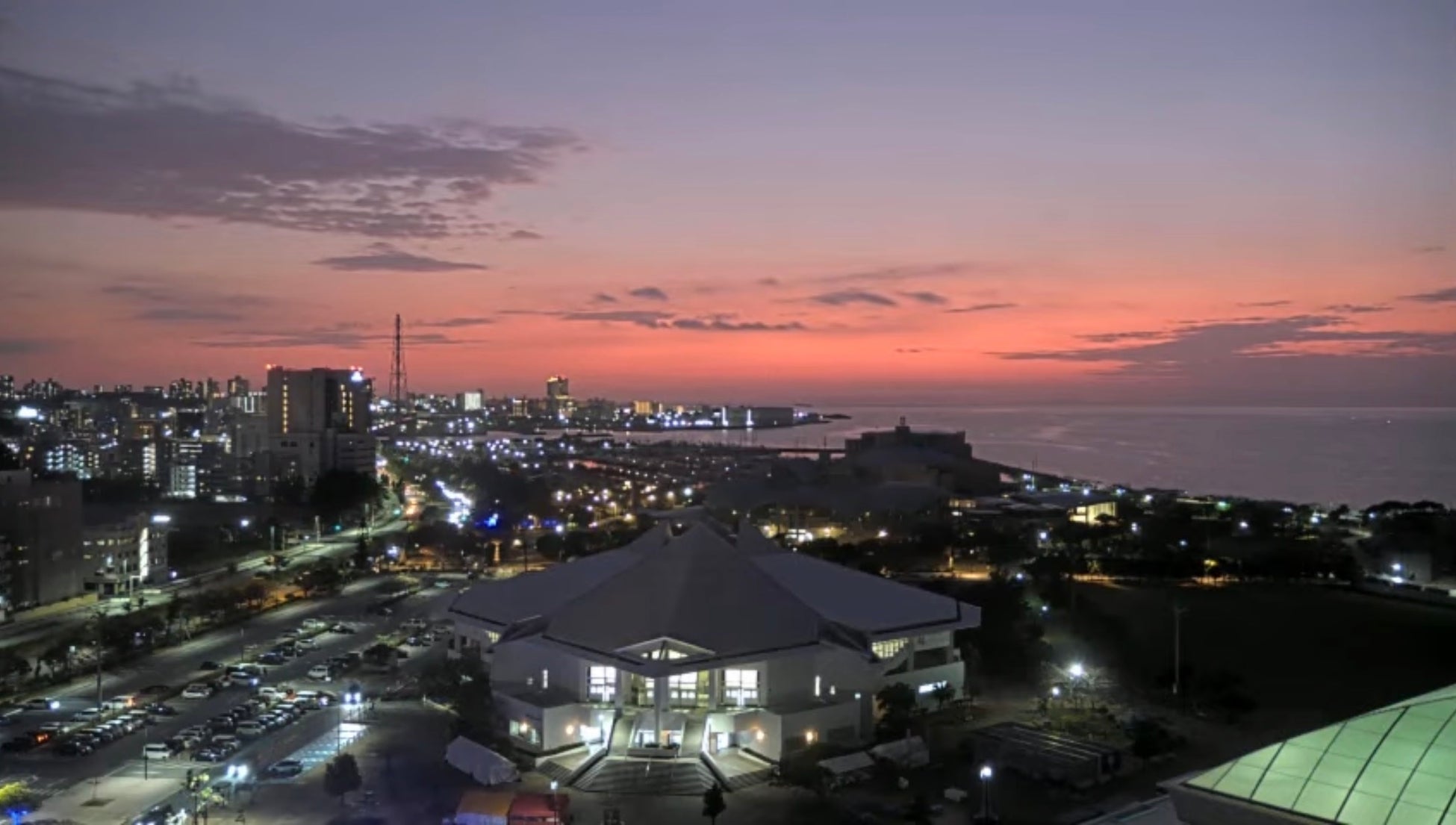 当館屋上に設置した定点カメラが、宜野湾市から見渡す東シナ海の絶景をリアルタイムで映し出します。時間帯によって色を変える眺望が24時間いつでもお楽しみ頂けます。
