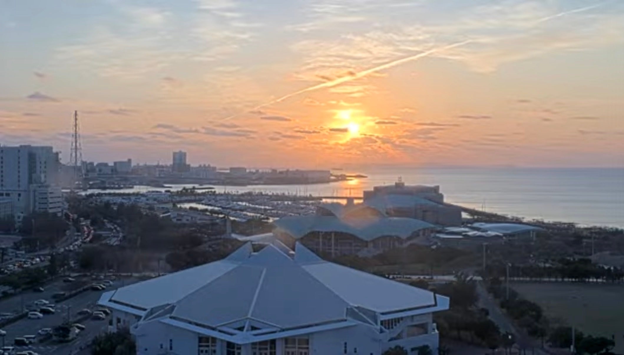 当館屋上に設置した定点カメラが、宜野湾市から見渡す東シナ海の絶景をリアルタイムで映し出します。時間帯によって色を変える眺望が24時間いつでもお楽しみ頂けます。