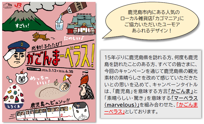 九州旅客鉄道株式会社と西日本旅客鉄道株式会社は、2026年3月12日に九州新幹線全線開業15周年及び山陽・九州新幹線直通運転15周年を迎えるにあたり、鹿児島県・公益社団法人鹿児島県観光連盟のご協力のもと、山陽・九州新幹線の終着地である鹿児島県での観光キャンペーンを以下のとおり開催します。