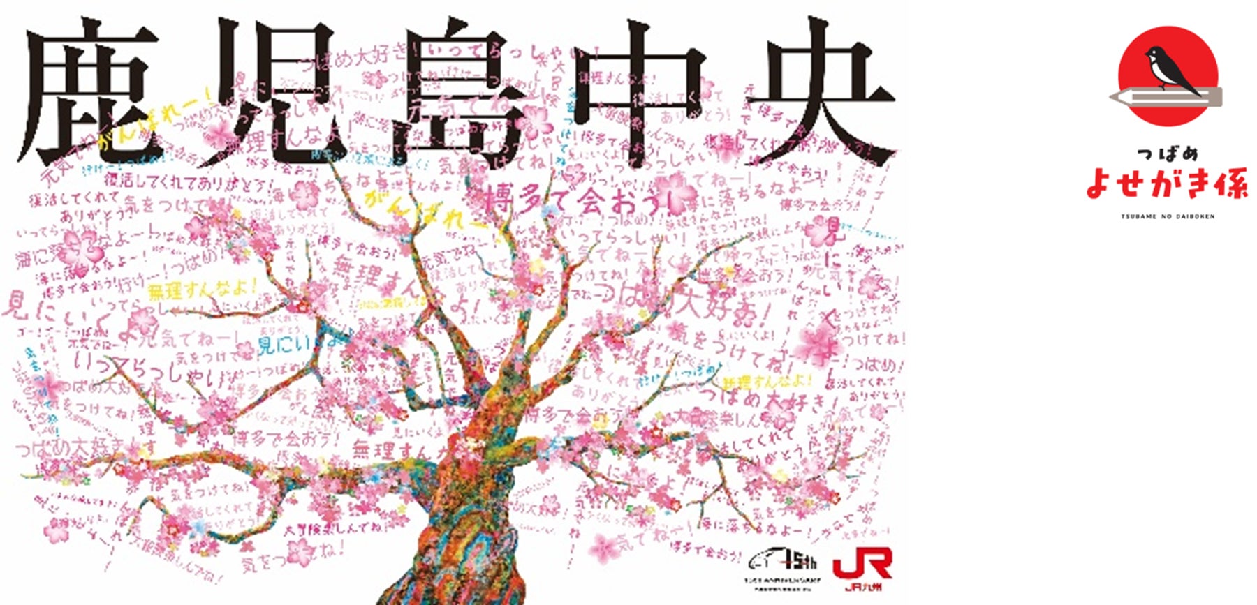 明日、2月27日(金)以降、九州新幹線の各駅(博多~鹿児島中央 全12駅)に、皆様から「つばめ」へのメッセージを記入いただける応援旗を設置いたします。記載いただいた応援旗は、3月29日(日)に熊本港から「つばめ」とともに出発し、各地を回り博多駅前に展示いたします。どなたでも、メッセージをお書きいただけますので、ぜひ、みなさまのメッセージで桜の木を満開にしてください!