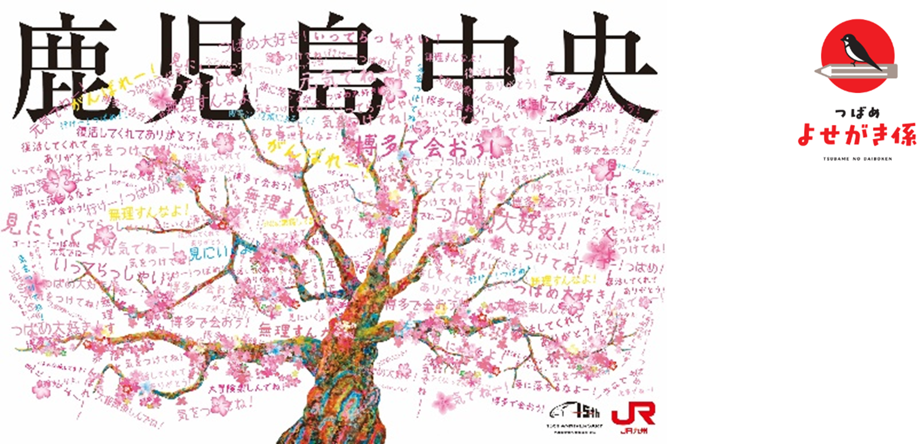明日、2月27日(金)以降、九州新幹線の各駅(博多~鹿児島中央 全12駅)に、皆様から「つばめ」へのメッセージを記入いただける応援旗を設置いたします。記載いただいた応援旗は、3月29日(日)に熊本港から「つばめ」とともに出発し、各地を回り博多駅前に展示いたします。どなたでも、メッセージをお書きいただけますので、ぜひ、みなさまのメッセージで桜の木を満開にしてください!