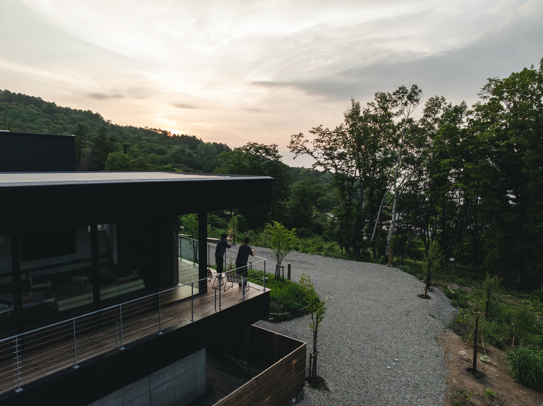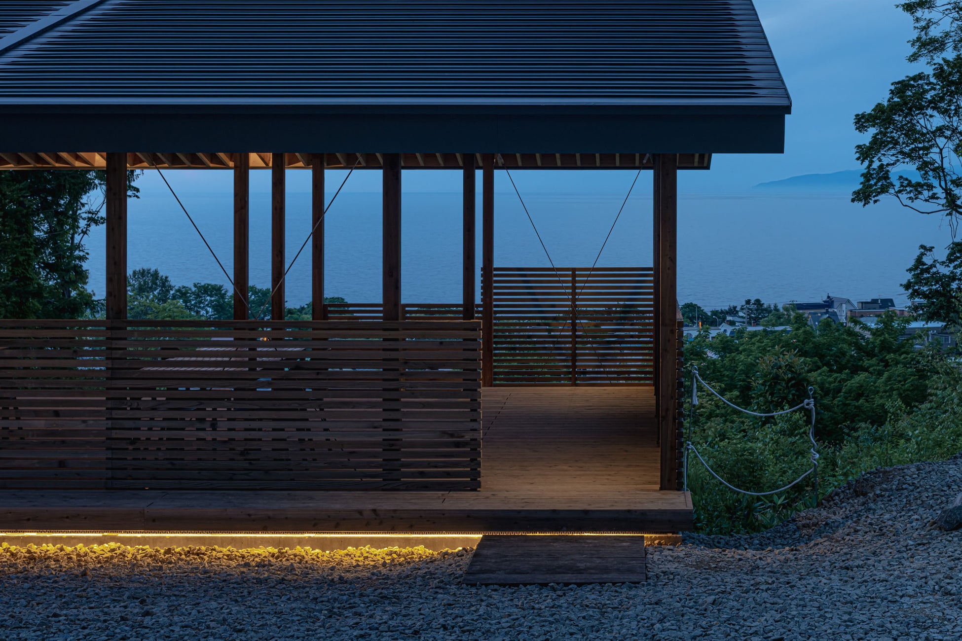 『暮らすように泊まる』をテーマとするヴィラ5棟をはじめ、地域の食や文化を発信する商業棟・ショップ、書道家のギャラリー、訪問者が思い思いに過ごせる東屋・デッキがあり、全ての建築に道産カラマツ・ナラ・タモ・道南スギなど、北海道で育った木材をふんだんに使用。道産木材の他にも札幌軟石など地域の素材を用い、春香の自然景観に静かに溶け込む建築を実現しています。