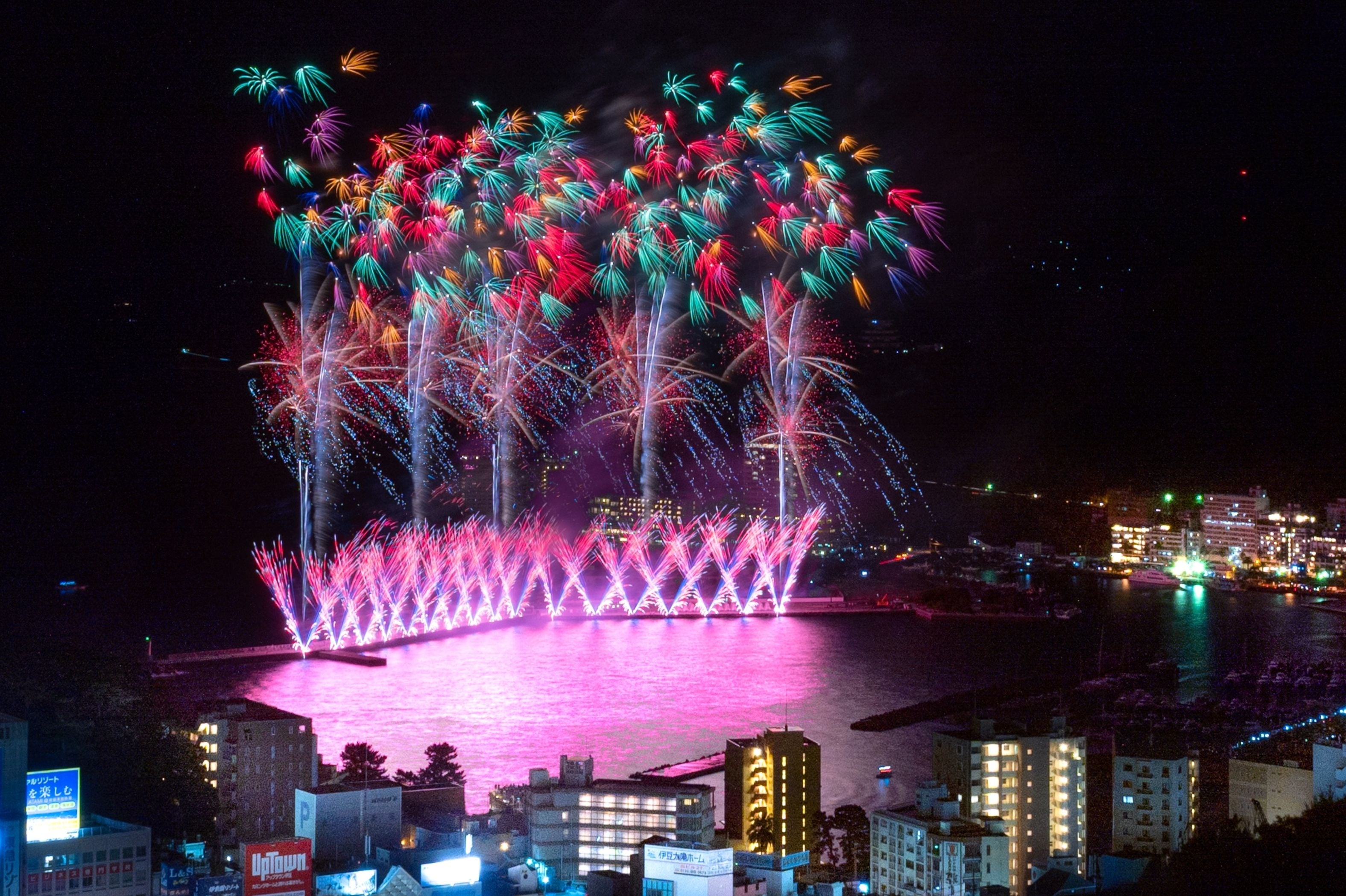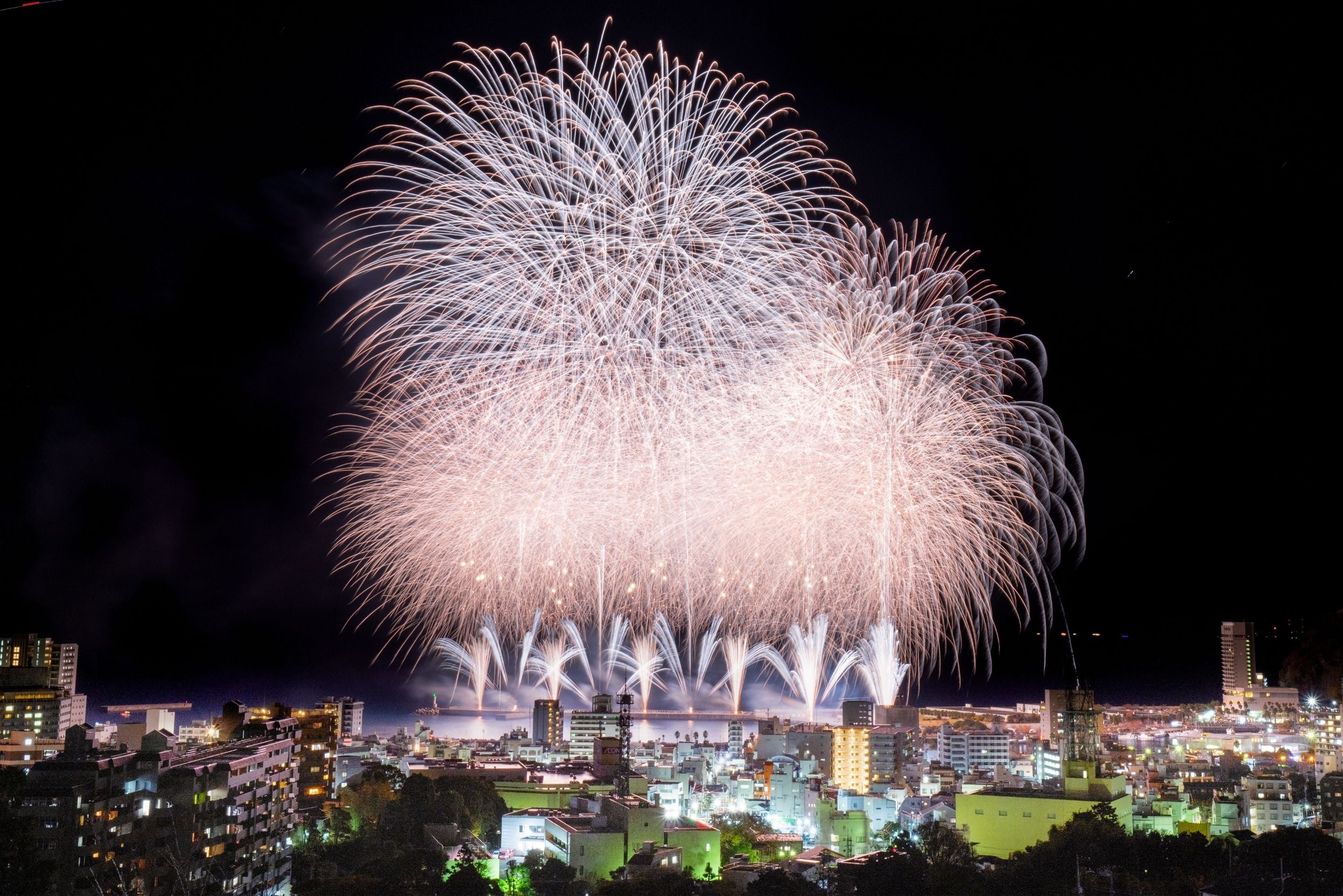 熱海海上花火大会は、昭和27年から開催しており2024年(令和6年)夏で73年目を迎えます。昭和24年8月31日「キティー台風」による高波で海岸地区140戸あまりの家屋が流失する災害、そして翌昭和25年には「熱海駅前火災」、更に10日後には中心街の979戸が焼失した大火に見舞われ、その後の復興に向け、地元市民による努力が続きました。街の復興とその努力に報いるべく、昭和27年に花火を打ち上げたのが始まりです。以来その伝統が受け継がれ、今では一年を通して開催しており、熱海の代名詞となりつつあります。
