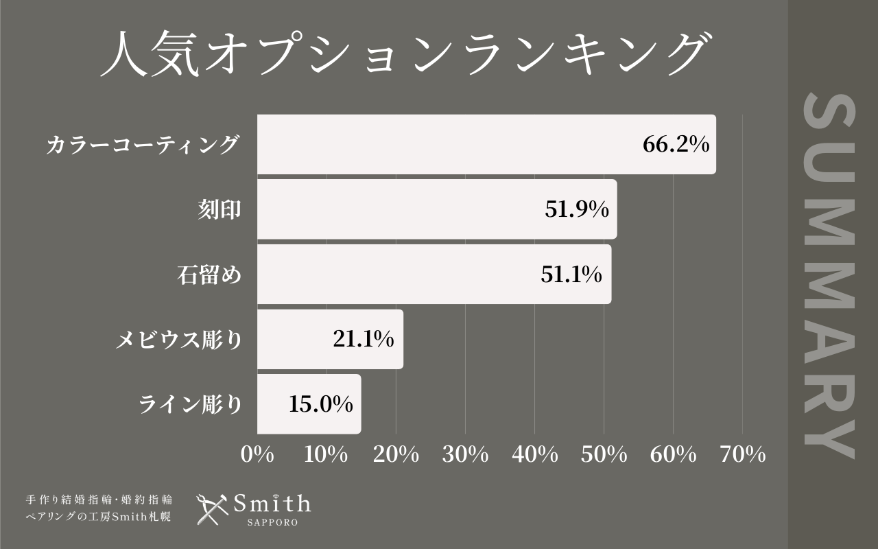 2026年1月の集計では、「カラーコーティング」と「刻印」が引き続き高い支持を集め、手作りペアリングにおいて「おふたりだけの特別感」を表現する上で欠かせない定番オプションとしての地位を、改めて確固たるものとしました。
