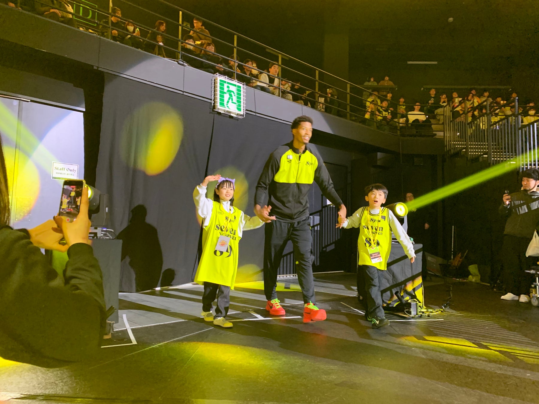 当日は、当選した6歳から11歳までの27名の子どもたちが参加。試合開始前に参加者が集合し、スタッフから流れの説明を受けた後、選手と対面しました。初めは緊張していた子どもたちも、憧れの選手から優しく声をかけられると次第に表情が和らいでいく様子が見られました。本番では、会場を埋め尽くす観客の歓声と照明演出の中、選手と手をつなぎ堂々とコートへ入場しました。