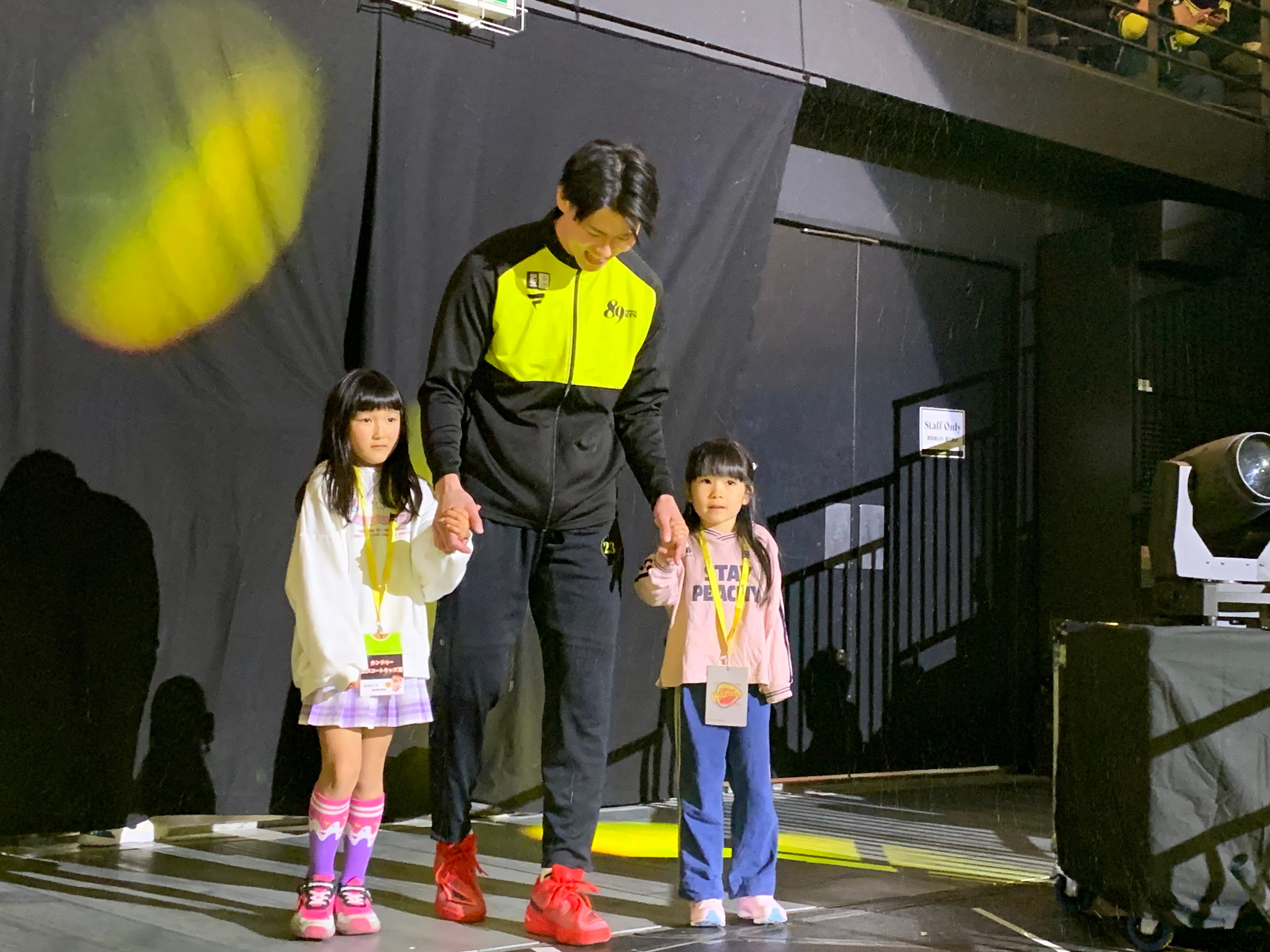 当日は、当選した6歳から11歳までの27名の子どもたちが参加。試合開始前に参加者が集合し、スタッフから流れの説明を受けた後、選手と対面しました。初めは緊張していた子どもたちも、憧れの選手から優しく声をかけられると次第に表情が和らいでいく様子が見られました。本番では、会場を埋め尽くす観客の歓声と照明演出の中、選手と手をつなぎ堂々とコートへ入場しました。