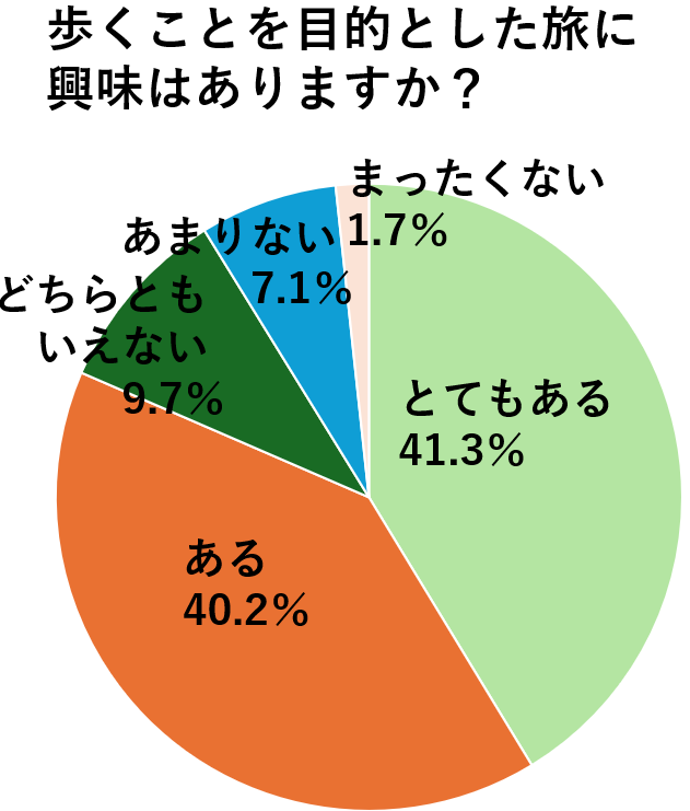 「旅好きな50歳以上」に歩くこと自体を目的とした旅への興味について伺ったところ、とてもあるという人が41.3%、あるという人が40.2%で多くの人が「歩き旅」に対して興味を持っていることが分かりました。(n=1060)