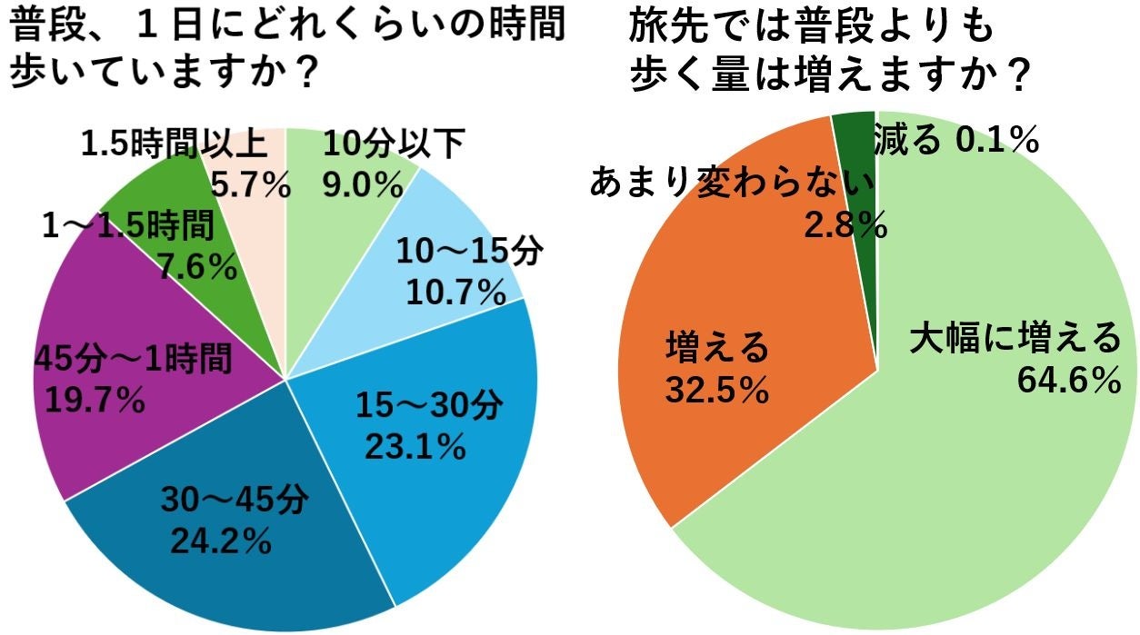 平時は、15~45分が47.3%で、ボリュームゾーン。日常では、短時間派が中心ですが、旅先では、97.1%が歩行量の増加を実感しています。旅は、自然と歩行増を引き出す運動量アップのきっかけになり得ることを示しています。(n=1060)
