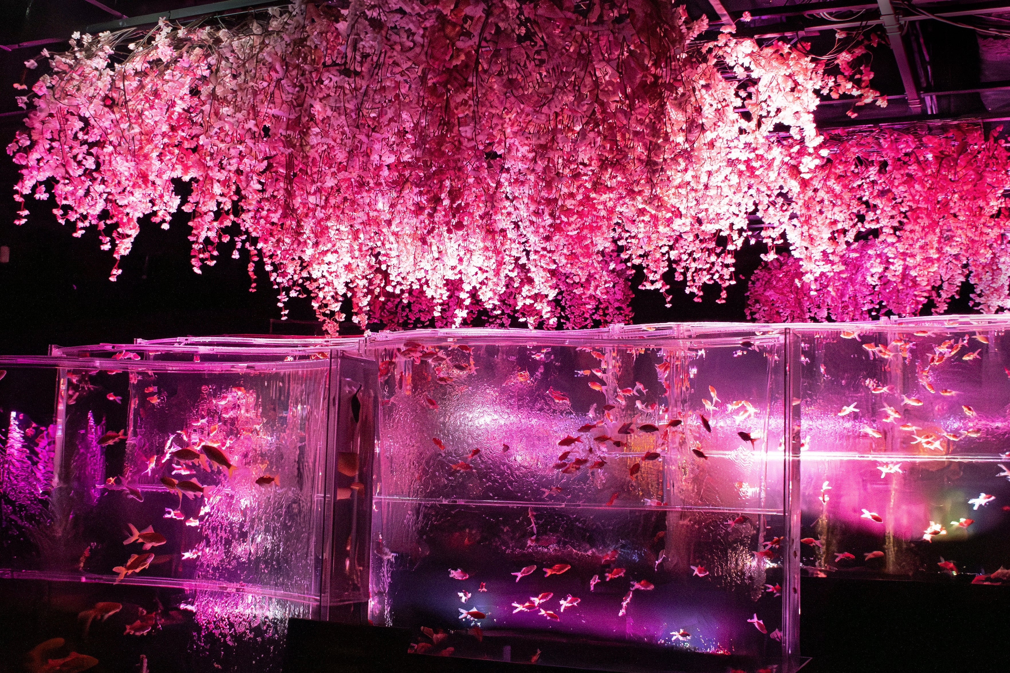 こちらの作品エリアに並ぶ水槽内を桜の花が飾り、様々な彩りに変化するライティングとともに幻想的な春の様子を表現します。