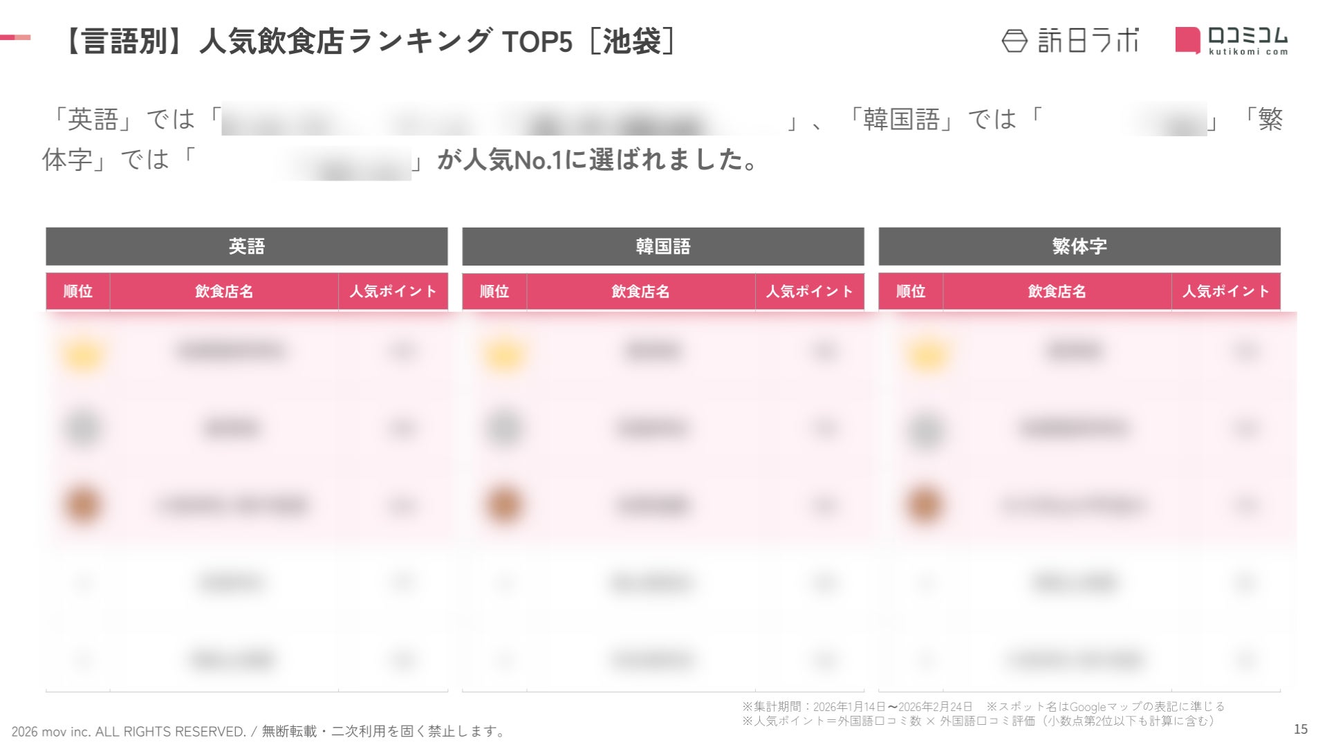 業界最大級のインバウンドビジネスメディア「訪日ラボ」及び 店舗向け集客一元化プラットフォーム「口コミコム」を運営する株式会社mov(代表取締役:渡邊 誠、本社:東京都渋谷区、以下mov)は、池袋の飲食店に寄せられた最新の口コミデータから、独自の『インバウンド人気飲食店ランキング』を発表しました。