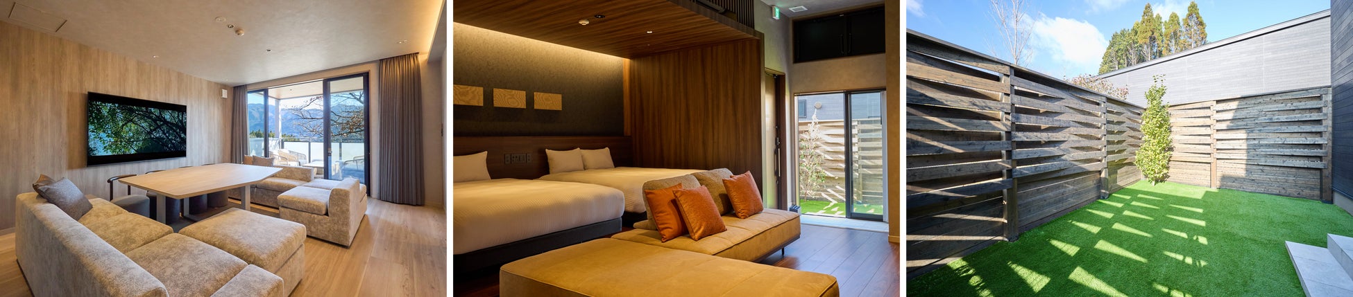 本施設は、山々の眺望を楽しめる湯布院の高台に建つヴィラ型宿泊施設です。湯布院ICから車で約3分、JR由布院駅からタクシーで約7分の場所に位置し、福岡をはじめとした県外や大分空港からのアクセスも良好です。客室は、定員4〜6名の平屋タイプと、2家族や3世代でも利用しやすい定員8~10名の2階建てメゾネットタイプから選ぶことが可能です。全20室のうち17室は1棟貸し切りになっており、まるで別荘のような贅沢なプライベート空間で、家族や友人とくつろぐことができます。すべての客室には自家源泉を堪能できるお風呂やサウナ(注)、開放的なテラス、家電や調理器具等が付いたキッチンなど充実した設備を備えています。さらに、2階建てメゾネットタイプの客室のうち5室には岩造りの専用露天風呂やサウナ、外気浴スペースを備えた離れを設け、非日常の体験を満喫することができます。