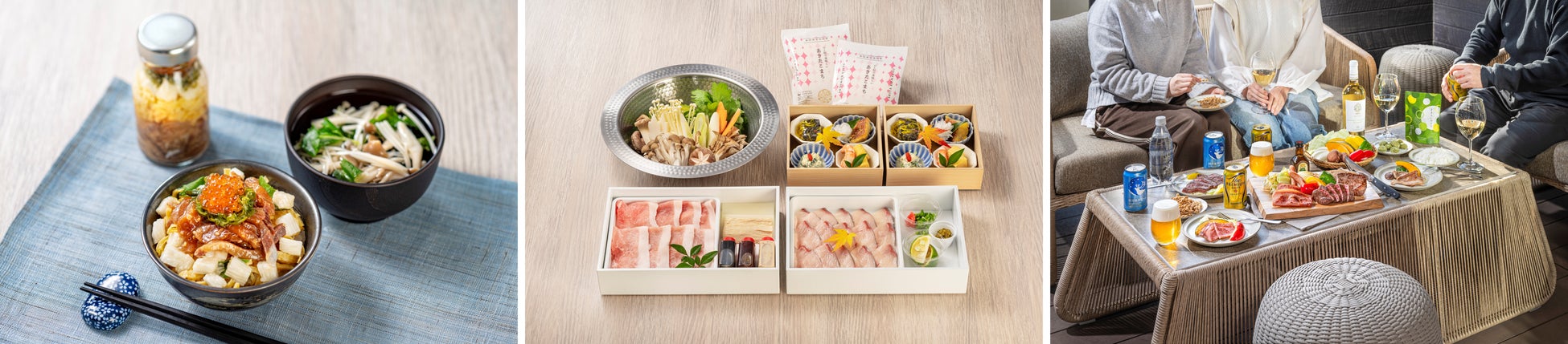 食事付きの宿泊プランでは、地元の食材を使用した朝食や夕食を提供します。下ごしらえした食材を冷蔵庫にセットしているため、簡単な調理をするだけで時間を気にせず自分たちのペースで食事をすることができます。湯布院の旅館「旅亭 田乃倉」の料理長が監修した朝食「大分県産かぼすブリのりゅうきゅう丼」、夕食「大分県産かぼすブリと奥豊後豚のしゃぶしゃぶ」のほか、テラスで楽しむ「豊後牛もも肉ステーキと奥豊後豚の鉄板焼き」など、この土地ならではの食を味わえます。