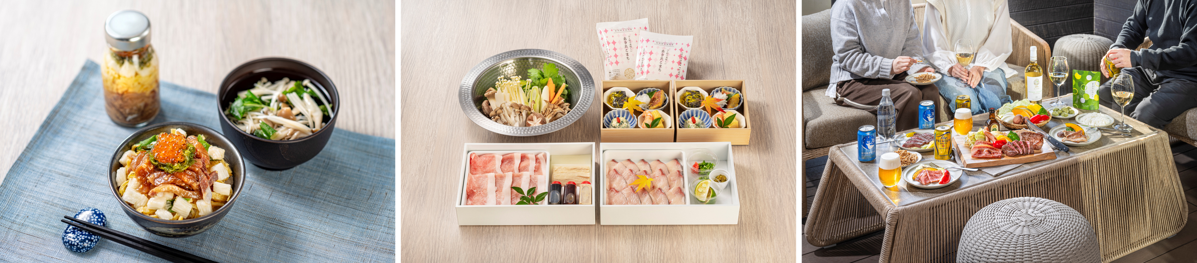 食事付きの宿泊プランでは、地元の食材を使用した朝食や夕食を提供します。下ごしらえした食材を冷蔵庫にセットしているため、簡単な調理をするだけで時間を気にせず自分たちのペースで食事をすることができます。湯布院の旅館「旅亭 田乃倉」の料理長が監修した朝食「大分県産かぼすブリのりゅうきゅう丼」、夕食「大分県産かぼすブリと奥豊後豚のしゃぶしゃぶ」のほか、テラスで楽しむ「豊後牛もも肉ステーキと奥豊後豚の鉄板焼き」など、この土地ならではの食を味わえます。